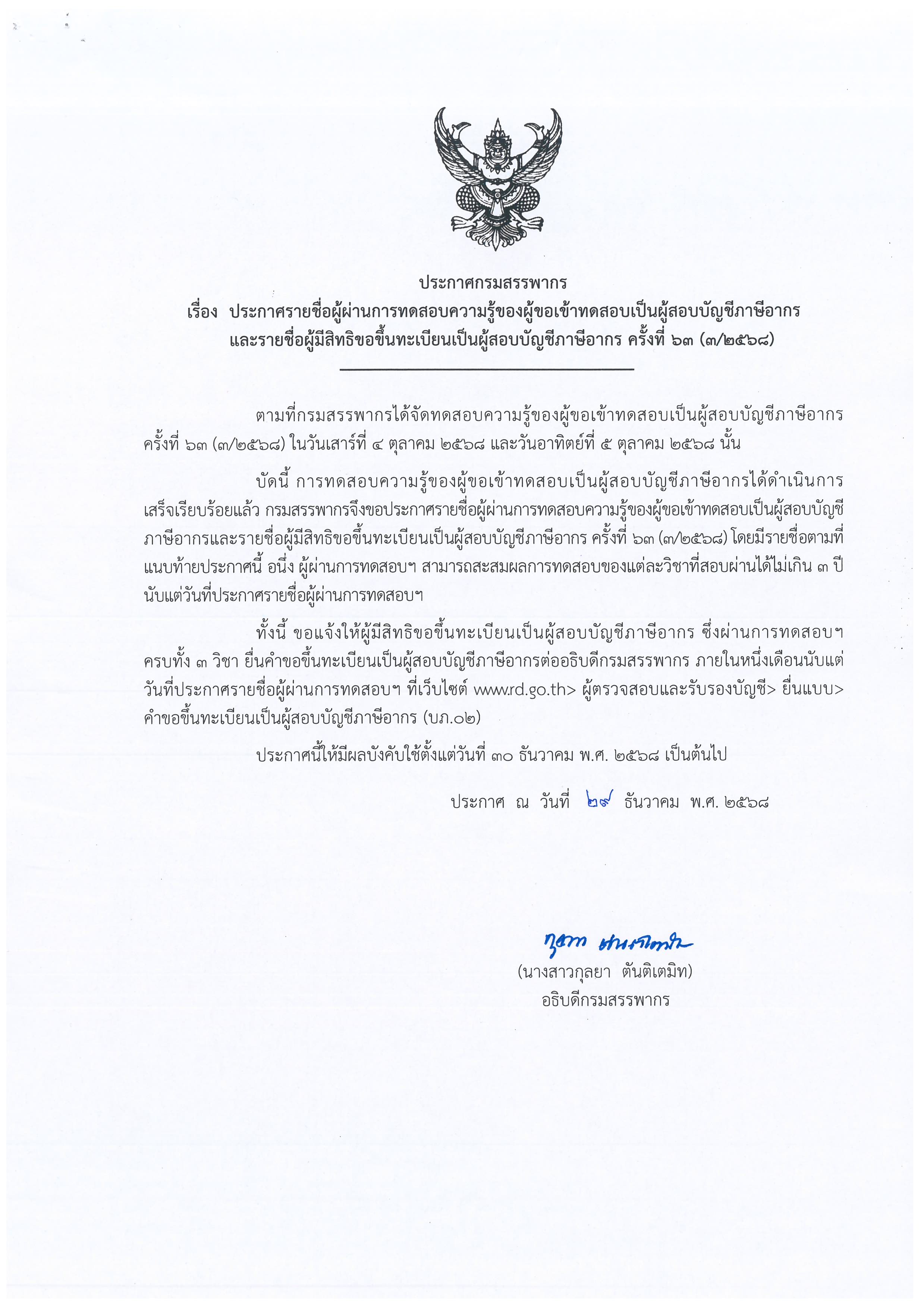 ประกาศกรมสรรพากร เรื่อง ประกาศรายชื่อผู้ผ่านการทดสอบความรู้ของผู้ขอเข้าทดสอบเป็นผู้สอบบัญชีภาษีอากรและรายชื่อผู้มีสิทธิขอขึ้นทะเบียนเป็นผู้สอบบัญชีภาษีอากร ครั้งที่ 63 (3/2568)