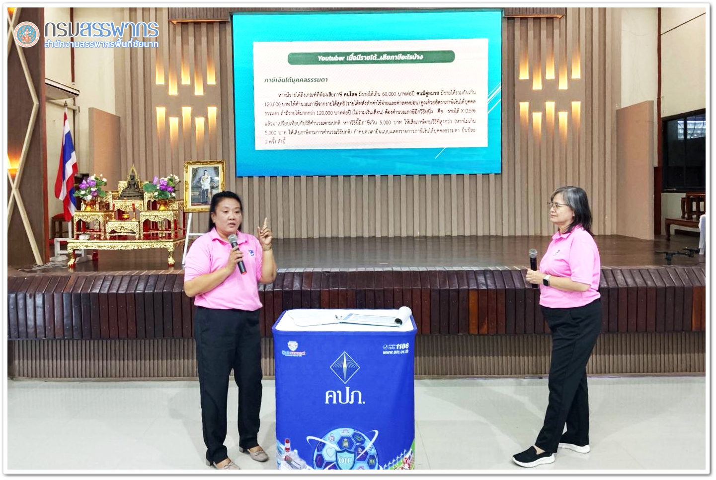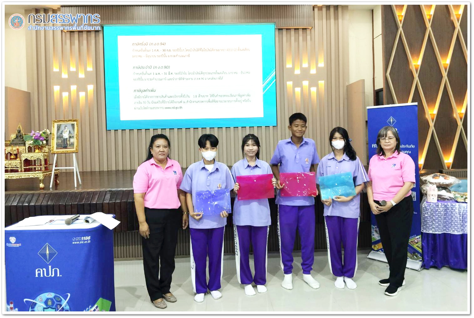 สำนักงานสรรพกรพื้นที่ชัยนาท นำโดยนางสาวศิริลักษณ์ ภู่สอาด เจ้าพนักงานสรรพากรอาวุโส พร้อมคณะ เข้าร่วมโครงการยุวชนนักสื่อสารประกันภัยรุ่นใหม่ ประจำปี 2568 โดยมีวัตถุประสงค์เพื่อเผยแพร่ประชาสัมพันธ์ ความรู้ด้านภาษีอากรให้กับเยาวชน ครั้งที่ 1 วันที่ 16 มิถุนานยน 2568 ณ โรงเรียนองค์การบริหารส่วนจังหวัดชัยนาท, คร้้งที่ 2 วันที่ 20 มิถุนานยน 2568 ณ โรงเรียนสาครพิทยาคม, ครั้งที่ 3 วันที่ 24 มิถุนานยน 2568 โรงเรียนคุรุประชาสรรค์
