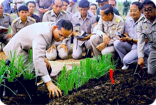 เมื่อวันที่ 24 สิงหาคม 2524 พระบาทสมเด็จพระบรมชนกาธิเบศร มหาภูมิพลอดุลยเดชมหาราช บรมนาถบพิตร ทรงมีแนวพระราชดำริเกี่ยวกับการเร่งดินให้เป็นกรดจัดรุนแรงที่สุด ในเขตจังหวัดนราธิวาส ซึ่งเป็นที่ลุ่มต่ำ มีน้ำขังตลอดปีให้สามารถปลูกพืชได้ โดยการทำให้ดินแห้งและเปียกสลับกัน แล้วศึกษาวิธีการปรับปรุงดินโดยการใช้น้ำล้างดิน การใช้หินปูนฝุ่น และใช้ทั้งสองวิธีควบคู่กันไป สามารถปรับปรุงดินแก้ปัญหาดินเสีย เพื่อปลูกพืชเศรษฐกิจได้ | ![]() | |