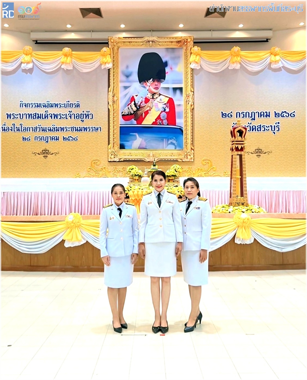 ท่านกฤษณ์ อัครพงศ์พิสัย สรรพากรพื้นที่สระบุรี มอบหมายให้นางสาวสุจิตรา เกษเพชร ตำแหน่งหัวหน้าส่วนแนะนำและตรวจสอบภาษี 02 พร้อมด้วยเจ้าหน้าที่ในสังกัด เป็นตัวแทนเข้าร่วมพิธีถวายเครื่องราชสักการะและวางพานพุ่ม และพิธีจุดเทียนถวายพระพรชัยมงคล แด่พระบาทสมเด็จพระเจ้าอยู่หัวเนื่องในโอกาสวันเฉลิมพระชนมพรรษา 28 กรกฎาคม 2568