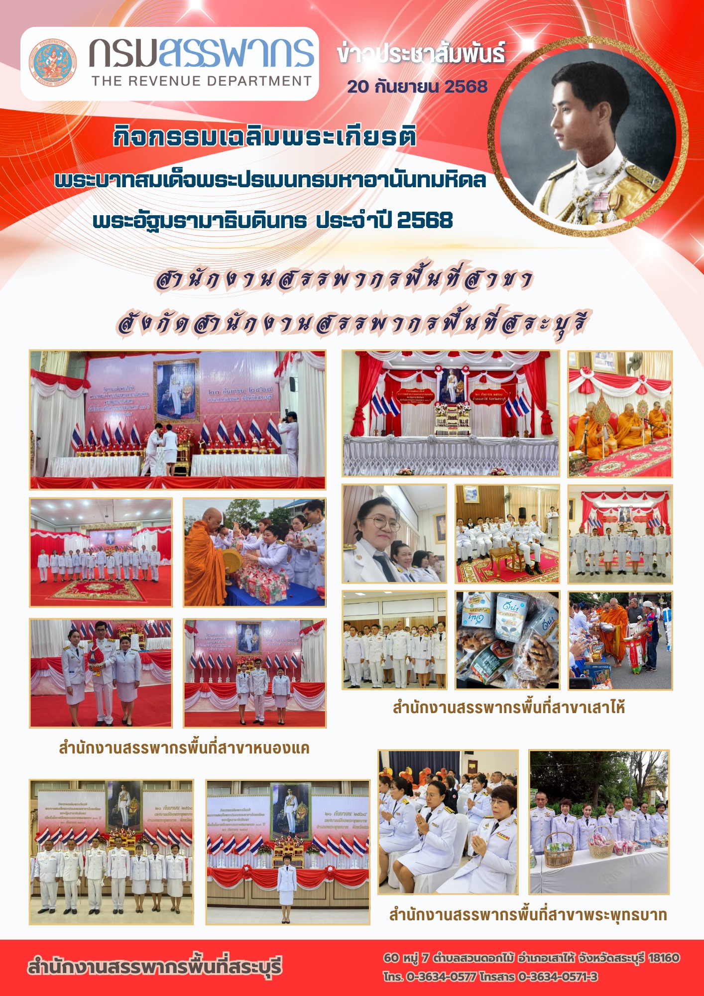 และในครั้งนี้ สำนักงานสรรพากรพื้นที่สาขาในสังกัดสำนักงานสรรพากรพื้นที่สระบุรี เข้าร่วมกิจกรรมเฉลิมพระเกียรติ พระบาทสมเด็จพระปรเมนทรมหาอานันทมหิดล พระอัฐมรามาธิบดินทร เนื่องในโอกาสวันพระบรมราชสมภพครบ 100 ปี 20 กันยายน 2568 ด้วย