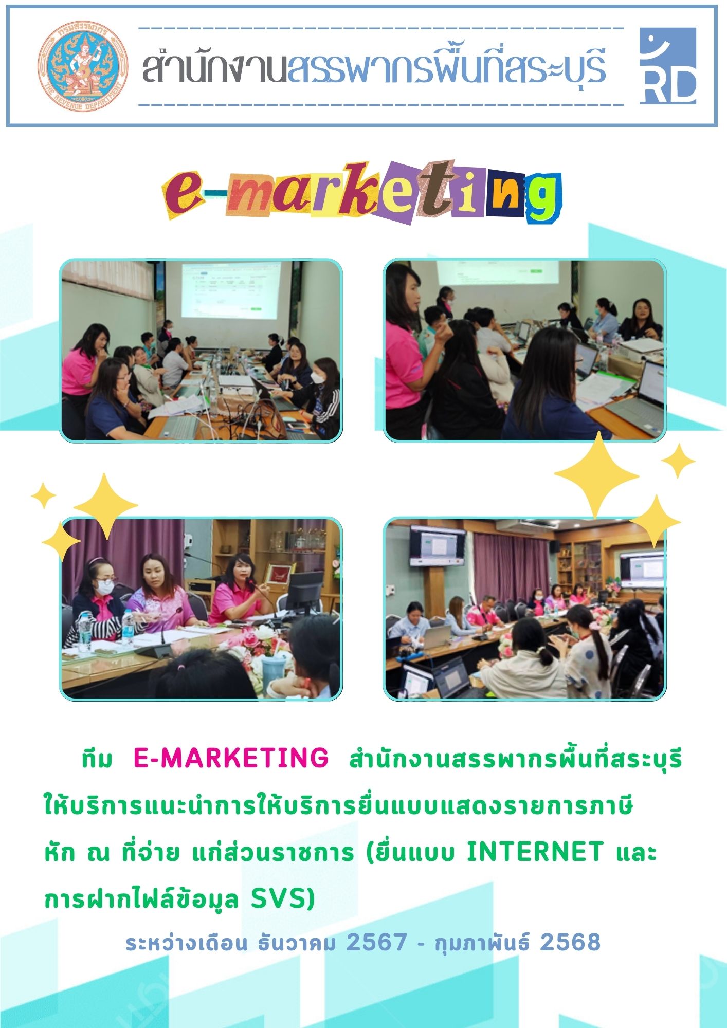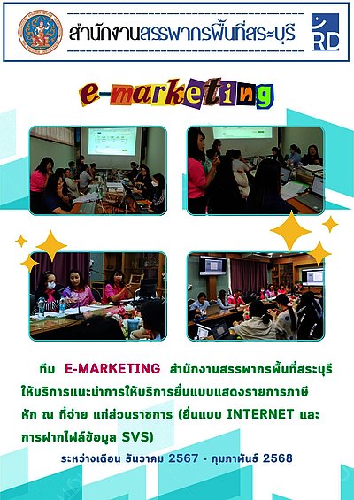 ✤ ทีม E-marketing สำนักงานสรรพากรพื้นที่สระบุรี ให้บริการแนะนำการให้บริการยื่นแบบแสดงรายการภาษีหัก ณ ที่จ่าย แก่ส่วนราชการ