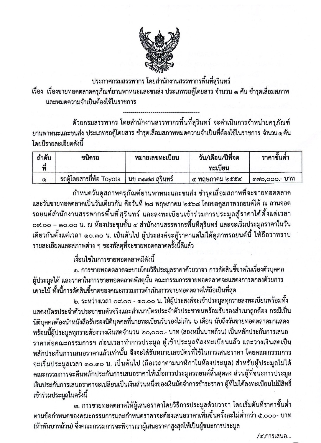 เรื่องขายทอดตลาดครุภัณฑ์ยานพาหนะและขนส่ง ประเภทรถตู้โดยสาร จำนวน 1 คัน ชำรุดเสื่อมสภาพและหมดความจำเป็นต้องใช้ในราชการ เอกสาร1เอกสาร2