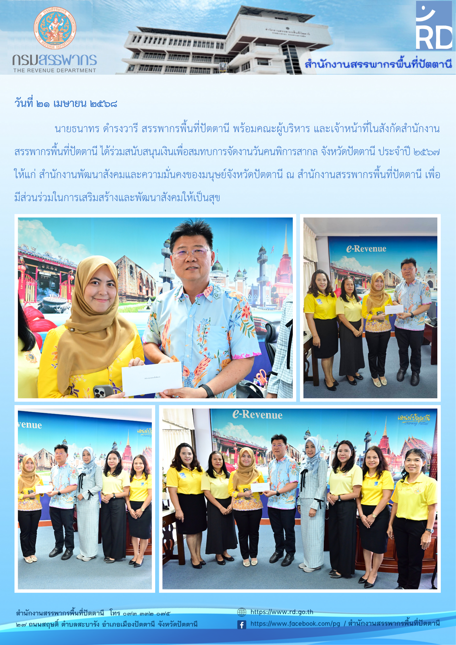 สำนักงานสรรพากรพื้นที่ปัตตานี ได้ร่วมสนับสนุนเงินเพื่อสมทบการจัดงานวันคนพิการสากล จังหวัดปัตตานี ประจำปี ๒๕๖๘