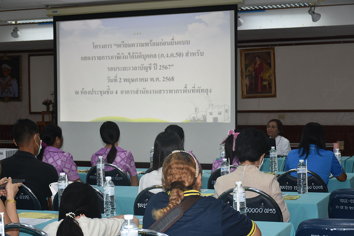 สำนักงานสรรพากรพื้นที่พัทลุง จัดโครงการประชุม "เตรียมความพร้อมก่อนการยื่นแบบแสดงรายการภาษีเงินได้นิติบุคคล (ภ.ง.ด.50) สำหรับรอบระยะเวลาบัญชี ปี 2567" เพื่อให้ความรู้ความเข้าใจที่ถูกต้องแก่สำนักงานบัญชี และผู้ประกอบการนิติบุคคลรายใหญ่ในท้องที่จังหวัดพัทลุง เกี่ยวกับการจัดทำบัญชี การจัดทำเอกสารหลักฐานประกอบการจัดทำบัญชี การจัดทำงบการเงิน งบดุล และเอกสารอื่นที่เกี่ยวข้องกับการยื่นแบบแสดงรายการภาษีเงินได้นิติบุคคล มาตรการและสิทธิประโยชน์ทางภาษี เป็นการเตรียมความพร้อมในการจัดทำบัญชี และการยื่นแบบแสดงรายการภาษีเงินได้นิติบุคคล (ภ.ง.ด.50) สำหรับรอบระยะเวลาบัญชี ปี 2567 โดยนางสาวงามศิลป์ รองขุน อดีตสรรพากรพื้นที่สตูล เป็นวิทยากรในการบรรยาย ณ ห้องประชุมสำนักงานสรรพากรพื้นที่พัทลุง เมื่อวันที่ 2 พฤษภาคม 2568