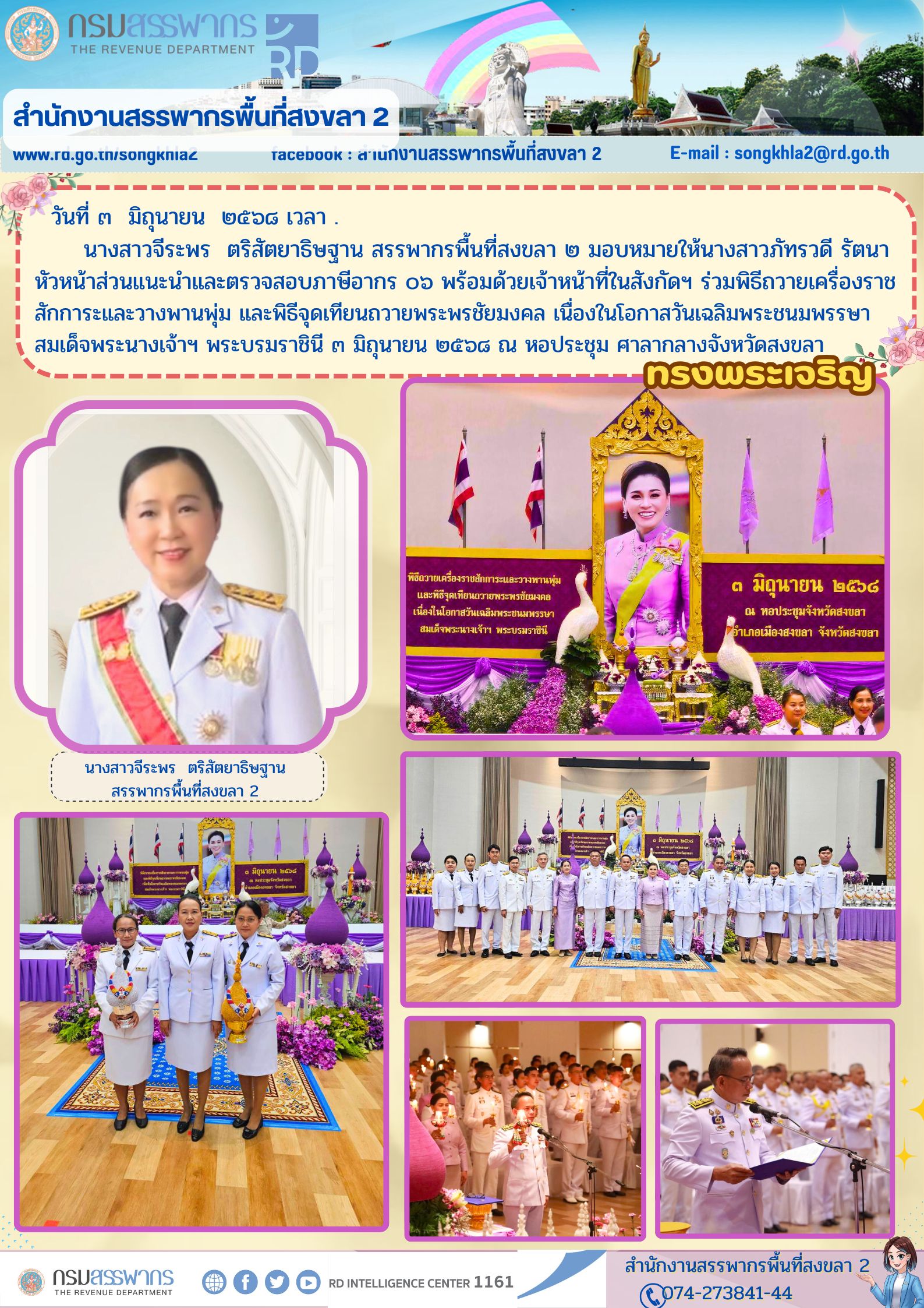 สำนักงานสรรพากรพื้นที่สงขลา 2 ร่วมพิธีถวายเครื่องราชสักการะและวางพานพุ่ม และพิธีจุดเทียนถวายพระพรชัยมงคล เนื่องในโอกาสวันเฉลิมพระชนมพรรษษ สมเด็จพระนางเจ้าฯ พระบรมราชินี 3 มิถุนายน 2568 ณ หอประชุม ศาลากลางจังหวัดสงขลา