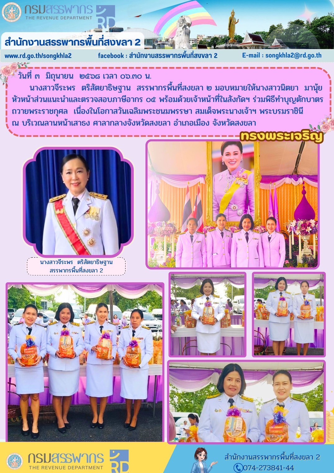 สำนักงานสรรพากรพื้นที่สงขลา 2 ร่วมพิธีทำบุญตักบาตรถวายพระราชกุศล เนื่องในโอกาสวันเฉลิมพระชนมพรรษา สมเด็จพระนางเจ้าฯ พระบรมราชินี ณ บริเวณลานหน้าเสาธง ศาลากลางจังหวัดสงขลา