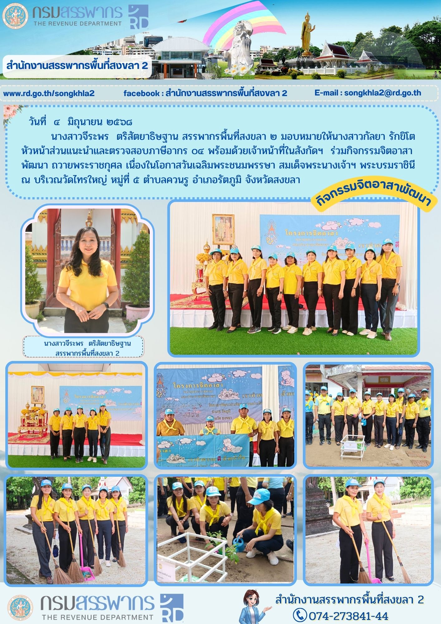 สำนักงานสรรพากรพื้นที่สงขลา 2 ร่วมกิจกรรมจิตอาสาพัฒนา ถวายพระราชกุศล เนื่องในโอกาสวันเฉลิมพระชนมพรรษา สมเด็จพระนางเจ้าฯ พระบรมราชินี ณ บริเวณวัดไทรใหญ่ หมู่ที่ 5 ตำบลควนรู อำเภอรัตภูมิ จังหวัดสงขลา