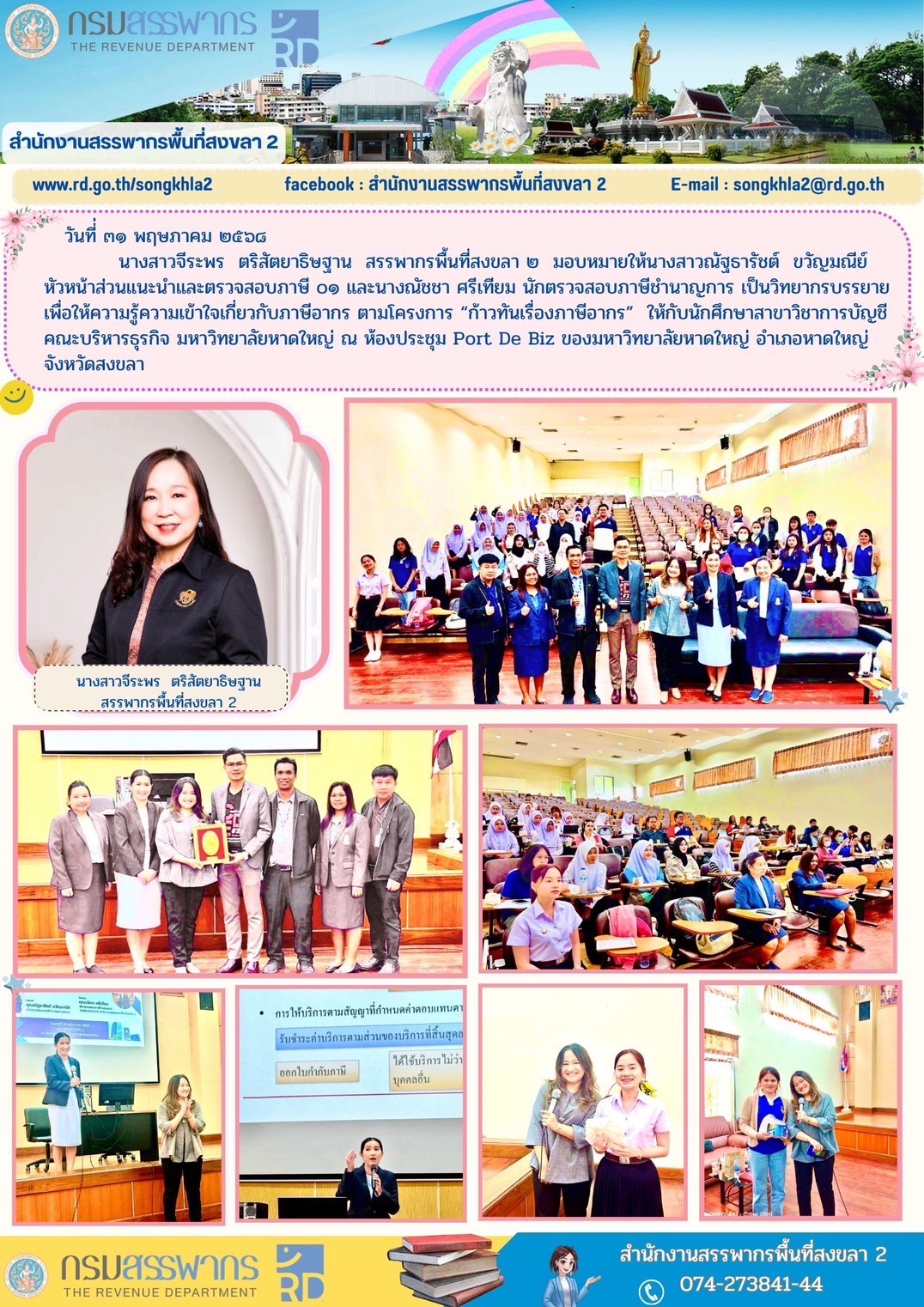 สำนักงานสรรพากรพื้นที่สงขลา 2 บรรยายให้ความรู้ตามโครงการ"ก้าวทันเรื่องภาษี"ให้กับนักศึกษา มหาวิทยาลัยหาดใหญ่