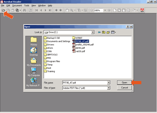 1. คลิกที่ Start Menu ด้านล่างซ้ายของหน้าจอดังรูป และเลือกเมนู Program จากนั้นหาเมนู Acrobat Reader แล้วคลิกเลือกเพื่อเปิดโปรแกรม Acrobat Reader ![]() 2. เมื่อคลิกเลือกที่เมนู Acrobat Reader จะแสดงหน้าจอดังรูป จากนั้นคลิกที่ไอคอนดังลูกศรสีส้มชี้เพื่อเปิด PDF File เมื่อคลิกจะแสดงหน้าต่างเพื่อให้เลือก PDF File ที่ Download ไว้ เมื่อเลือกเรียบร้อยแล้วกดปุ่ม Open