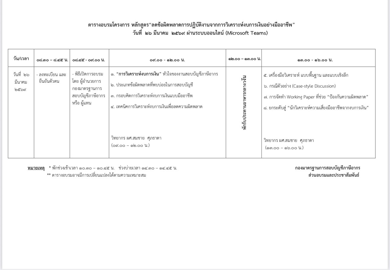 กองมาตรฐานการสอบบัญชีภาษีอากร จัดอบรม Online ผ่าน ระบบ Microsoft Teams หลักสูตร "ลดข้อผิดพลาดการปฏิบัติงานจากการวิเคราะห์งบการเงินอย่างมืออาชีพ" ในวันพฤหัสบดีที่ 26 มีนาคม 2569 เวลา 09.00 - 16.00 น. โดย ผศ.สมชาย ศุภธาดา เป็นวิทยากรบรรยาย