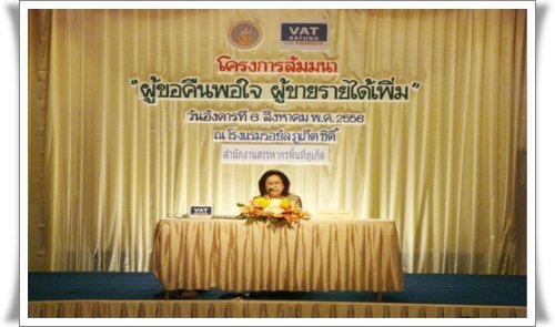 กลุ่มบริหารการคืนภาษีมูลค่าเพิ่มให้แก่นักท่องเที่ยว กรมสรรพากร และสำนักงานสรรพากรพื้นที่ภูเก็ตได้จัดโครงการสัมมนาหลักสูตร “ผู้ขอคืนพอใจ ผู้ขายรายได้เพิ่ม” เมื่อวันที่ 6 สิงหาคม 2556 ณ ห้องภูเก็ต แกรนด์ บอลรูม1 ชั้น2 โรงแรมรอยัล ภูเก็ต ซิตี้ จังหวัดภูเก็ต