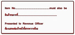 กรณีนักท่องเที่ยวซื้อสินค้าประเภท อัญมณีที่ประกอบเป็นตัวเรือนหรือของรูปพรรณ ทองรูปพรรณ นาฬิกา แว่นตา ปากกา โทรศัพทืแบบพกพาหรือสมาร์ทโฟน คอมพิวเตอร์แบบพกพา กระเป๋าถือ (ไม่รวมถึงกระเป๋าเดินทาง) เข็มขัด ที่มีมูลค่าการซื้อสินค้าแต่ละชิ้นตั้งแต่ 10,000 บาทขึ้นไป หรือสินค้าที่สามารถนำติดตัวไปพร้อมกับการเดินทางที่มีมูลค่าการซื้อสินค้าต่อชิ้นตั้งแต่ 50,000 บาทขึ้นไป ให้ประทับตราข้อความสีแดง (ตามตัวอย่างด้านล่าง) เพื่อให้นักท่องเที่ยวทราบว่าต้องนำสินค้าดังกล่าว ติดตัวไปแสดงต่อ เจ้าหน้าที่สรรพากรประจำท่าอากาศยานระหว่างประเทศ ในการขอคืนภาษีด้วย