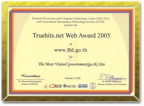 On February 2, 2006, Government Information Technology Services (GITS) awarded Truehits.net Web Award 2005 to the Revenue Department for the Most Visited Government(go.th) Site, www.rd.go.th