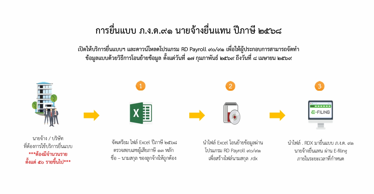 2. เปิดบริการยื่นแบบฯ และดาวน์โหลดโปรแกรม RD Payroll 90/91 เพื่อให้ผู้ประกอบการสามารถจัดทำข้อมูลแบบด้วยวิธีการโอนย้ายข้อมูล ตั้งแต่วันที่ 17 กุมภาพันธ์ 2569 จนถึงวันที่ 8 เมษายน 2569