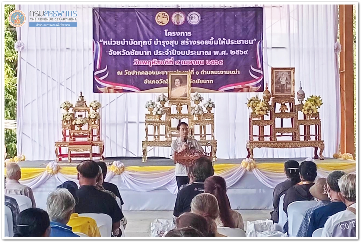 สำนักงานสรรพากรพื้นที่ชัยนาท เข้าร่วมการจัดโครงการ “หน่วยบำบัดทุกข์ บำรุงสุข สร้างรอยยิ้มให้ประชาชน” ประจำปี 2569 ณ วัดปากคลองมะขามเฒ่า หมู่ที่ 1 ตำบลมะขามเฒ่า อำเภอวัดสิงห์ จังหวัดชัยนาท โดยมีนายภูมิวัชร์ อุดมทรัพย์ ผู้ว่าราชการจังหวัดชัยนาท เป็นประธานเปิดโครงการฯ ในงานนี้สำนักงานสรรพากรพื้นที่ชัยนาทได้เปิดบูธให้ความรู้และให้คำปรึกษาเกี่ยวกับภาษีอากรกับประชาชนที่มาร่วมงาน พร้อมมอบของรางวัลเป็นที่ระลึก