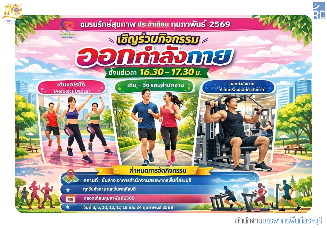 สำนักงานสรรพากรพื้นที่สระบุรี โดยชมรมรักษ์สุขภาพ จัดกิจกรรมออกกำลังกาย เต้นแอโรบิก ให้แก่เจ้าหน้าที่ในสังกัดได้ออกกำลังกายเพื่อส่งเสริมสุขภาพร่างกายให้แข็งแรง พร้อมทั้งผ่อนคลายความเครียด และเพิ่มความยืดหยุ่นมีสุขภาพที่ดีขึ้น