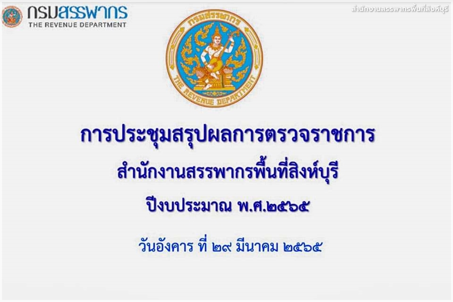 วันอังคารที่ 29 มีนาคม พ.ศ.2565 นางสาวเกษกาญจน์ หิรัญอร ผู้ตรวจราชการกรมสรรพากร(ตร.3) ประชุมสรุปผลการตรวจราชการของสำนักงานสรรพากรพื้นที่สิงห์บุรี ประจำปีงบประมาณ พ.ศ.2565 โดยมี นางสาวปรุงจิตร ฤกษ์บุญศรี สรรพากรพื้นที่สิงห์บุรี พร้อมด้วยหัวหน้าส่วนทุกส่วน และเจ้าหน้าที่ส่วนวางแผนและประเมินผล เข้าร่วมประชุมรับฟังสรุปผลการตรวจราชการ ผ่านทางระบบ Microsoft Teams