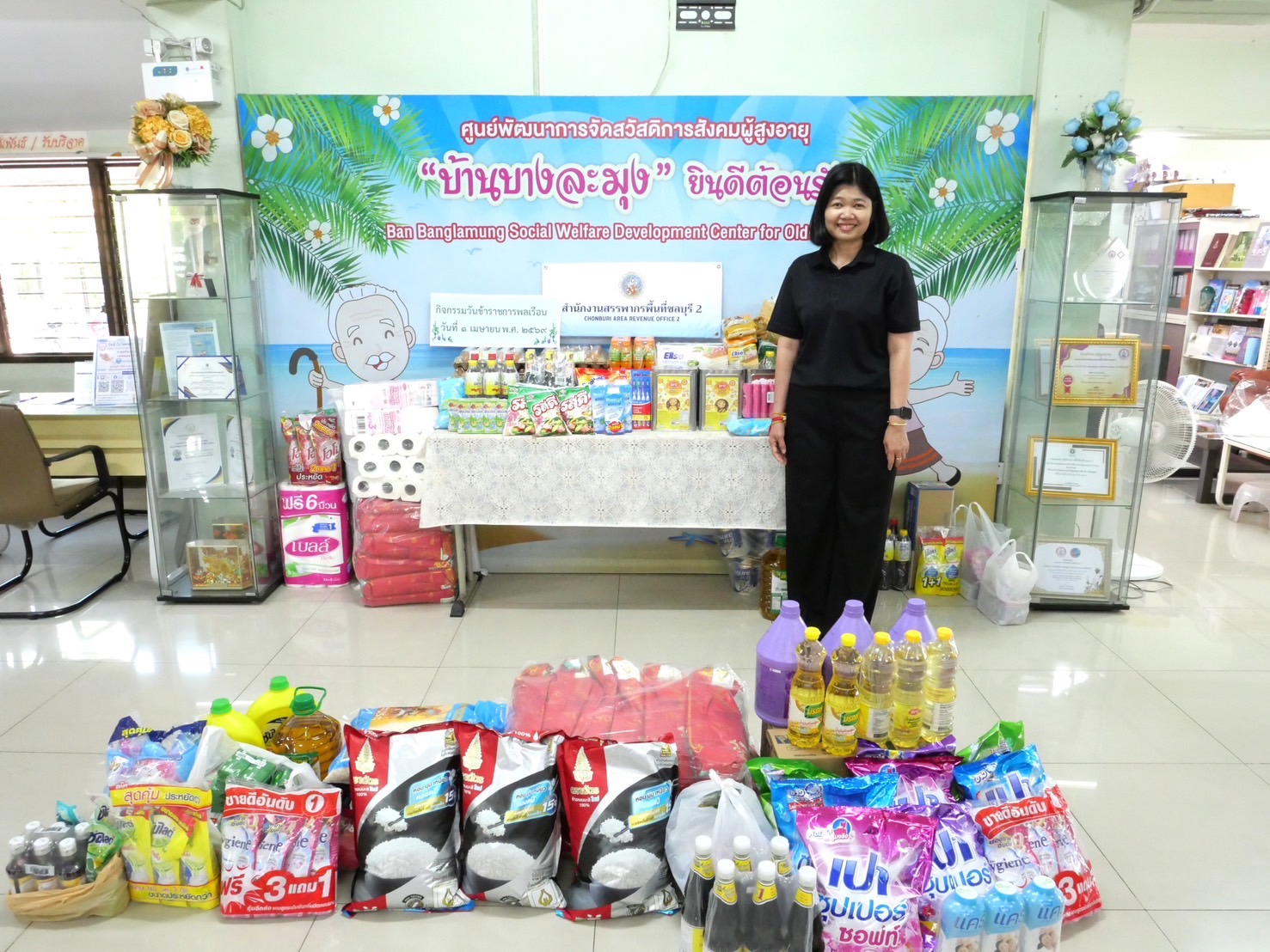 โดยการไปบริจาคเงินและสิ่งของให้กับมูลนิธิสงเคราะห์คนชราบ้านบางละมุง