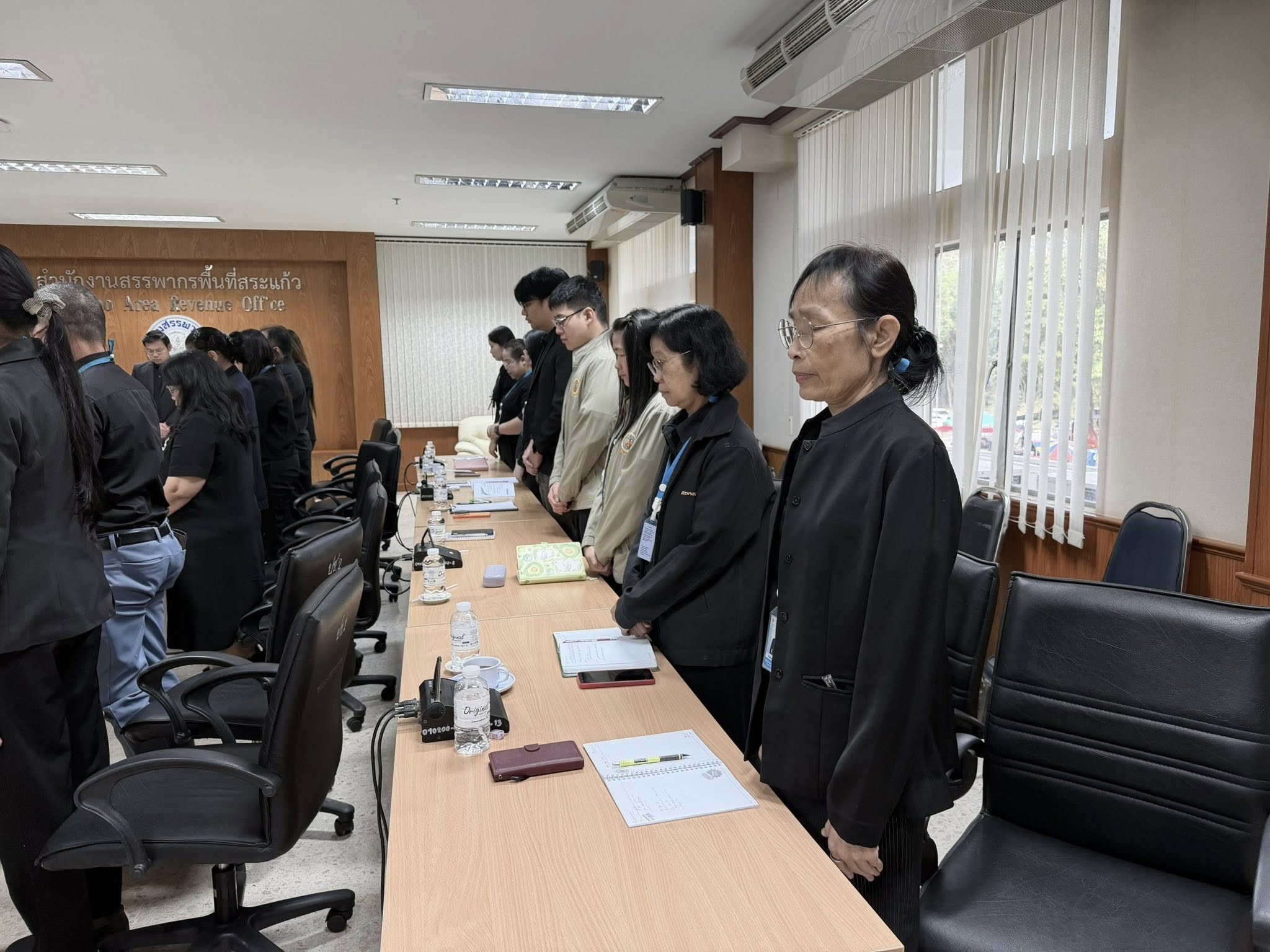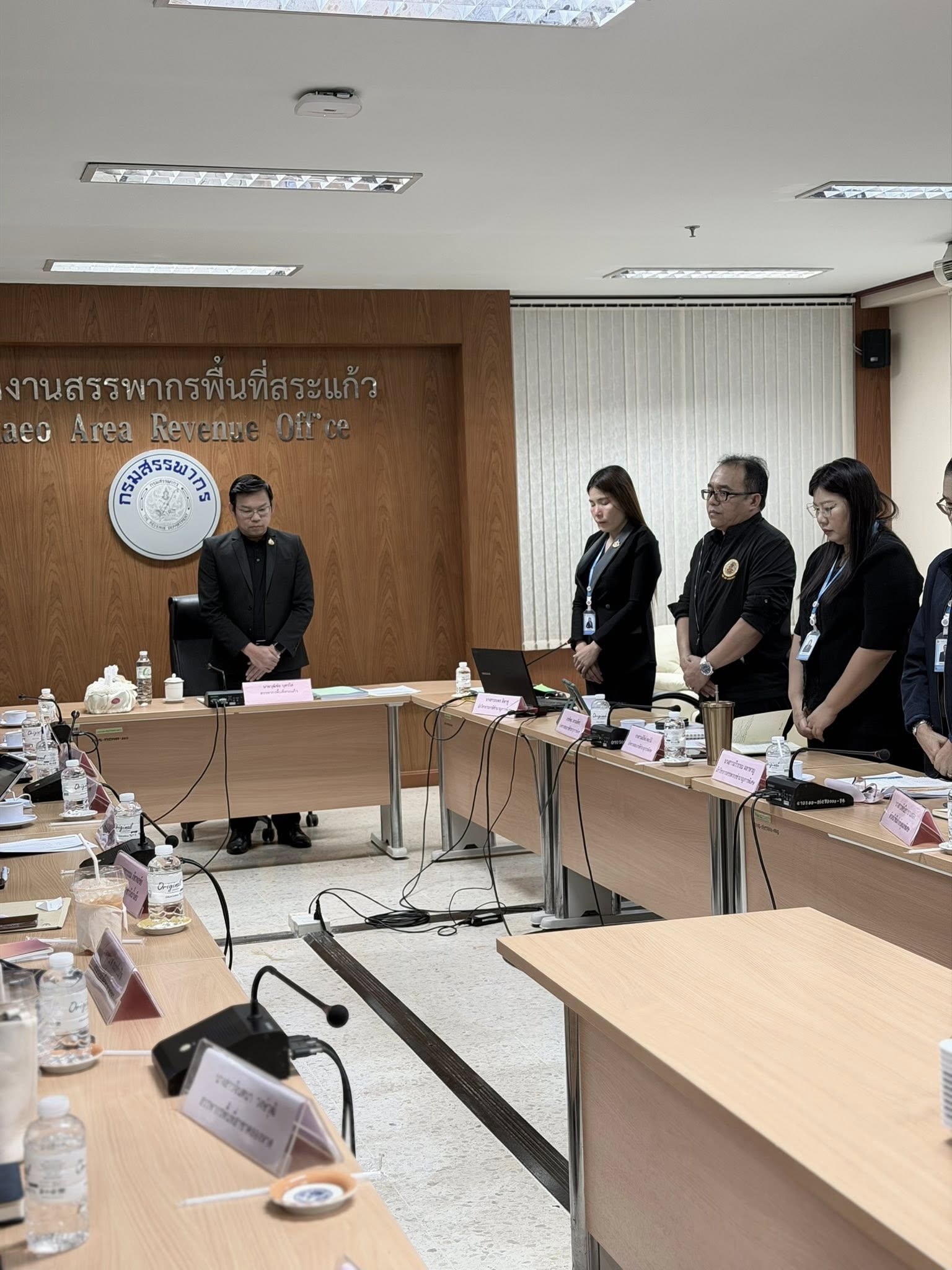 วันพฤหัสบดีที่ 18 ธันวาคม 2568 นายวุฒิชัย บุตรใส สรรพากรพื้นที่สระแก้ว พร้อมด้วยคณะผู้บริหาร สรรพากรอำเภอ ข้าราชการ และลูกจ้างในสังกัด ประชุมการบริหารงานจัดเก็บภาษีอากร (ก.บ.อ.) ครั้งที่ 1 ประจำปีงบประมาณพ.ศ. 2569 ณ ห้องประชุมชั้น 2 สำนักงานสรรพากรพื้นที่สระแก้ว ทั้งนี้ ก่อนเริ่มการประชุม นายวุฒิชัย บุตรใส สรรพากรพื้นที่สระแก้ว พร้อมด้วยคณะผู้บริหาร สรรพากรอำเภอ ข้าราชการ และลูกจ้างในสังกัด ยืนสงบนิ่งถวายความอาลัยแด่สมเด็จพระนางเจ้าสิริกิติ์ พระบรมราชินีนาถ พระบรมราชชนนีพันปีหลวง