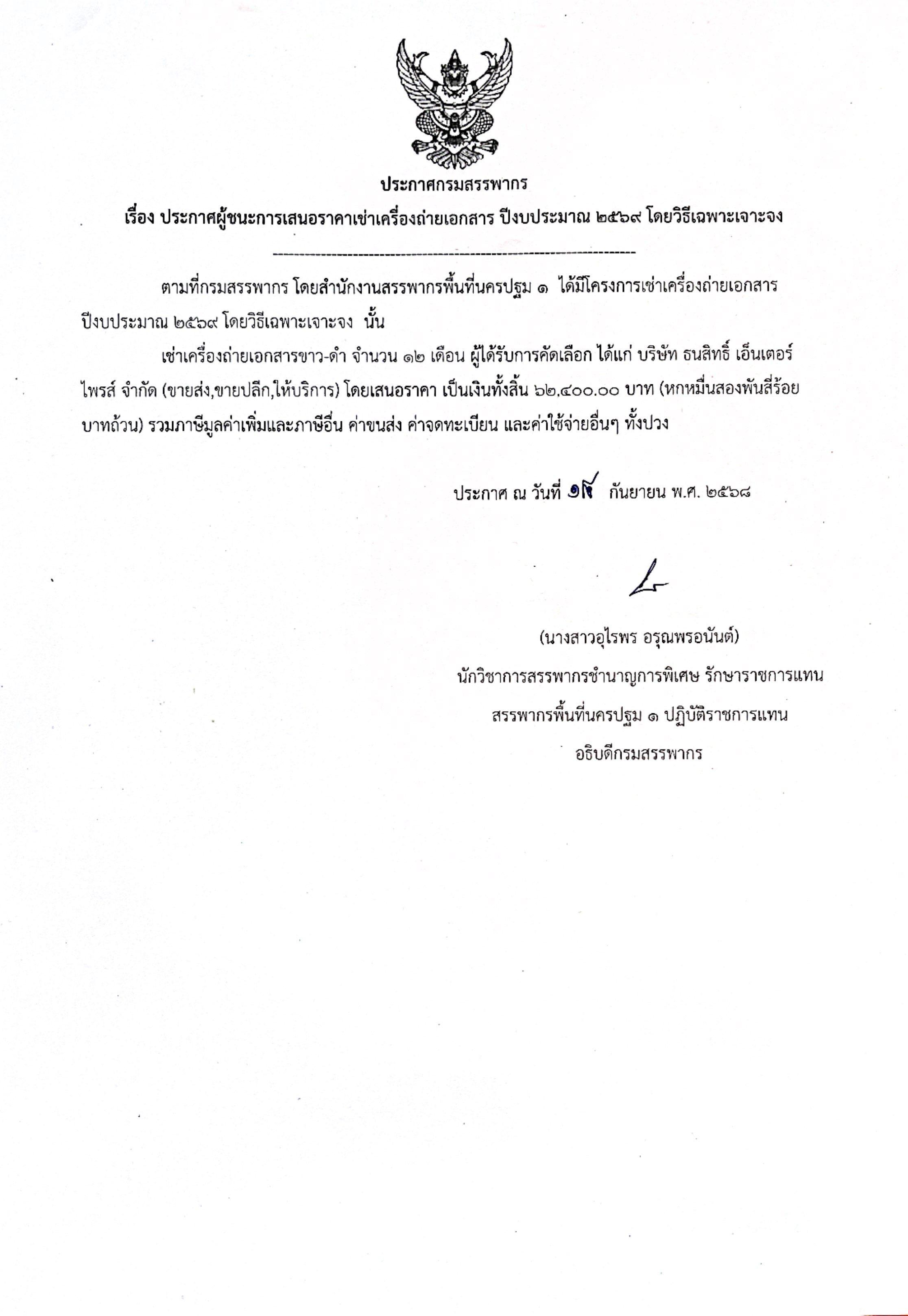 เรื่อง ประกาศผู้ชนะการเสนอราคาเช่าเครื่องถ่ายเอกสาร ปีงบประมาณ ๒๕๖๙ โดยวิธีเฉพาะเจาะจง