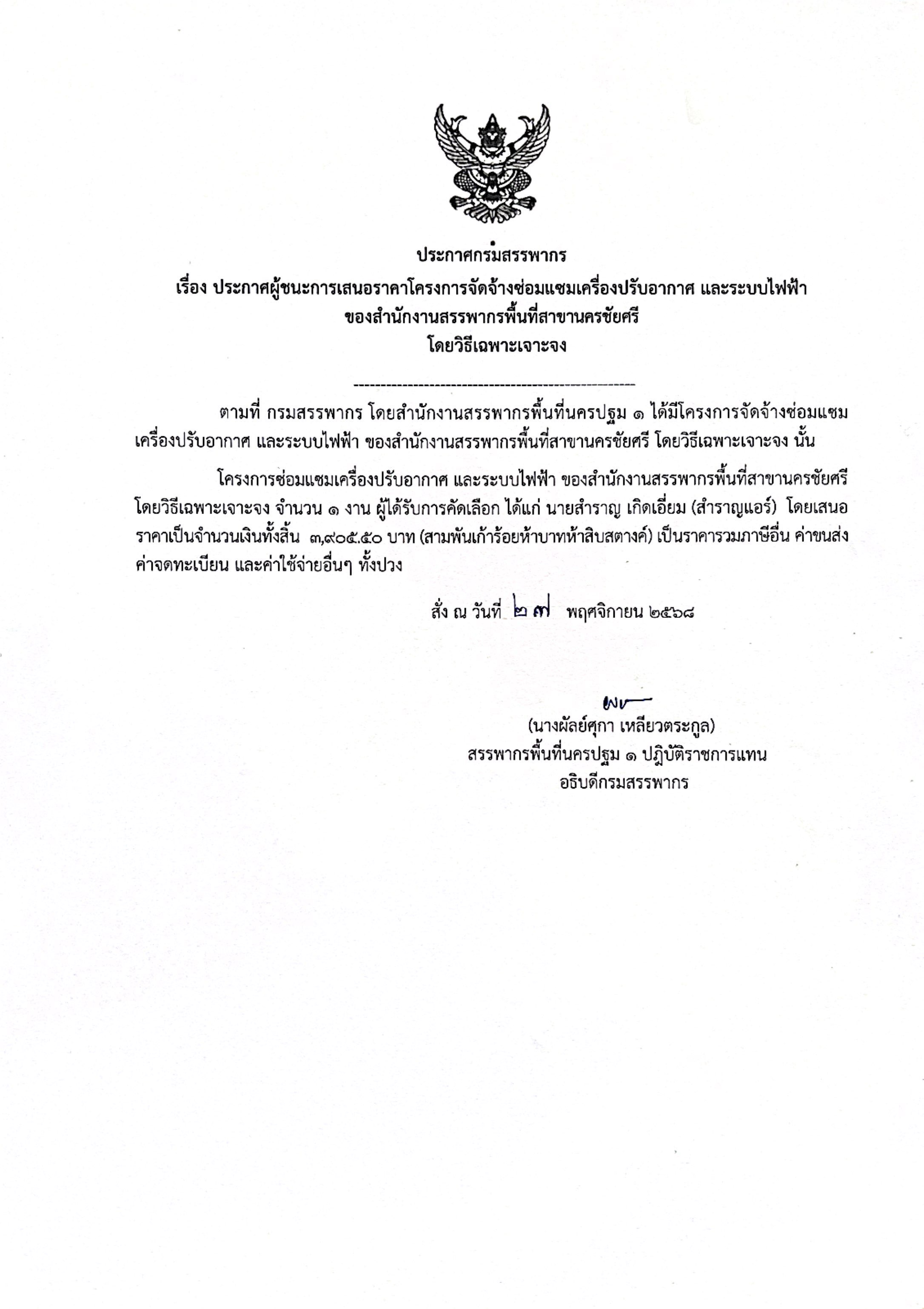 ประกาศกรมสรรพากร เรื่อง ประกาศผู้ชนะการเสนอราคาโครงการจัดจ้างซ่อมแซมเครื่องปรับอากาศ และระบบไฟฟ้าของสำนักงานสรรพากรพื้นที่นครชัยศรี โดยวิธีเฉพาะเจาะจง