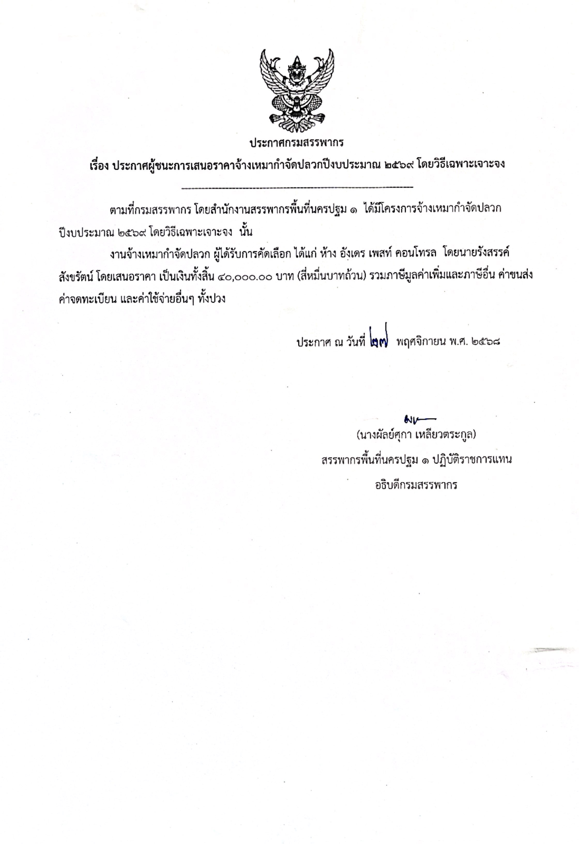 เรื่อง ประกาศผู้ชนะการเสนอราคาจ้างเหมากำจัดปลวกปีงบประมาณ ๒๕๖๙ โดยวิธีเฉพาะเจาะจง