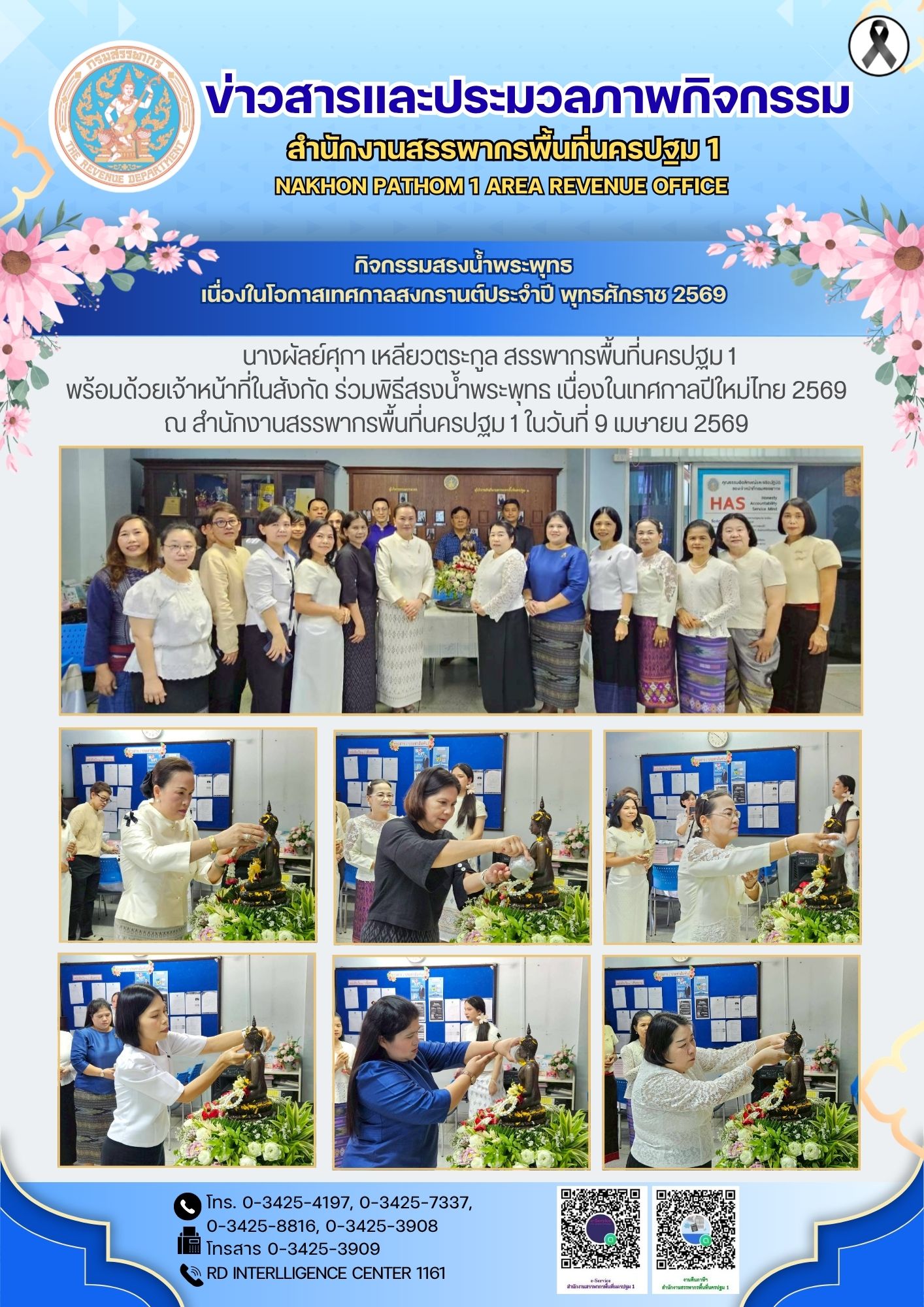 นางผัลย์ศุกา เหลียวตระกูล สรรพากรพื้นที่นครปฐม 1 พร้อมด้วยข้าราชการและบุคลากรในสังกัดสำนักงานสรรพากรพื้นที่นครปฐม 1 ร่วมกันตักบาตรข้าวสารอาหารแห้ง แด่พระภิกษุสงฆ์ ผู้ประพฤติปฏิบัติดี จากวัดท่าใน จำนวน 9 รูป และพิธีสรงน้ำพระพุทธ เนื่องในเทศกาลสงกรานต์ ปีพุทธศักราช 2569 ณ สำนักงานสรรพากรพื้นที่นครปฐม 1 ในวันที่ 9 เมษายน 2569