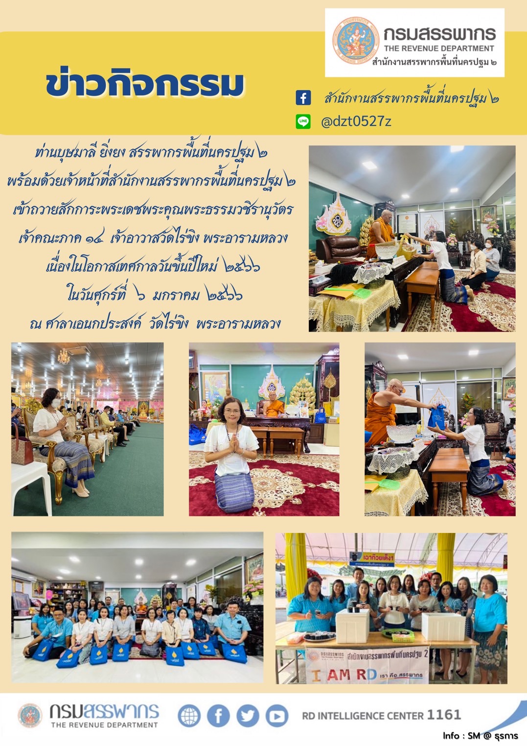 ท่านบุษมาลี ยิ่งยง สรรพากรพื้นที่นครปฐม 2 พร้อมด้วยเจ้าหน้าที่เข้าสักการะพระเดชพระคุณพระธรรมวชิรานุวัตร เจ้าคณะภาค 14 เจ้าอาวาสวัดไร่ขิง พระอารามหลวง เนื่องในโอกาสเทศกาลวันขึ้นปีใหม่ 2566 ในวันศุกรที่ 6 มกราคม 2566 ณ ศาลาเอนกประสงค์ วัดไร่ขิง พระอารามหลวง