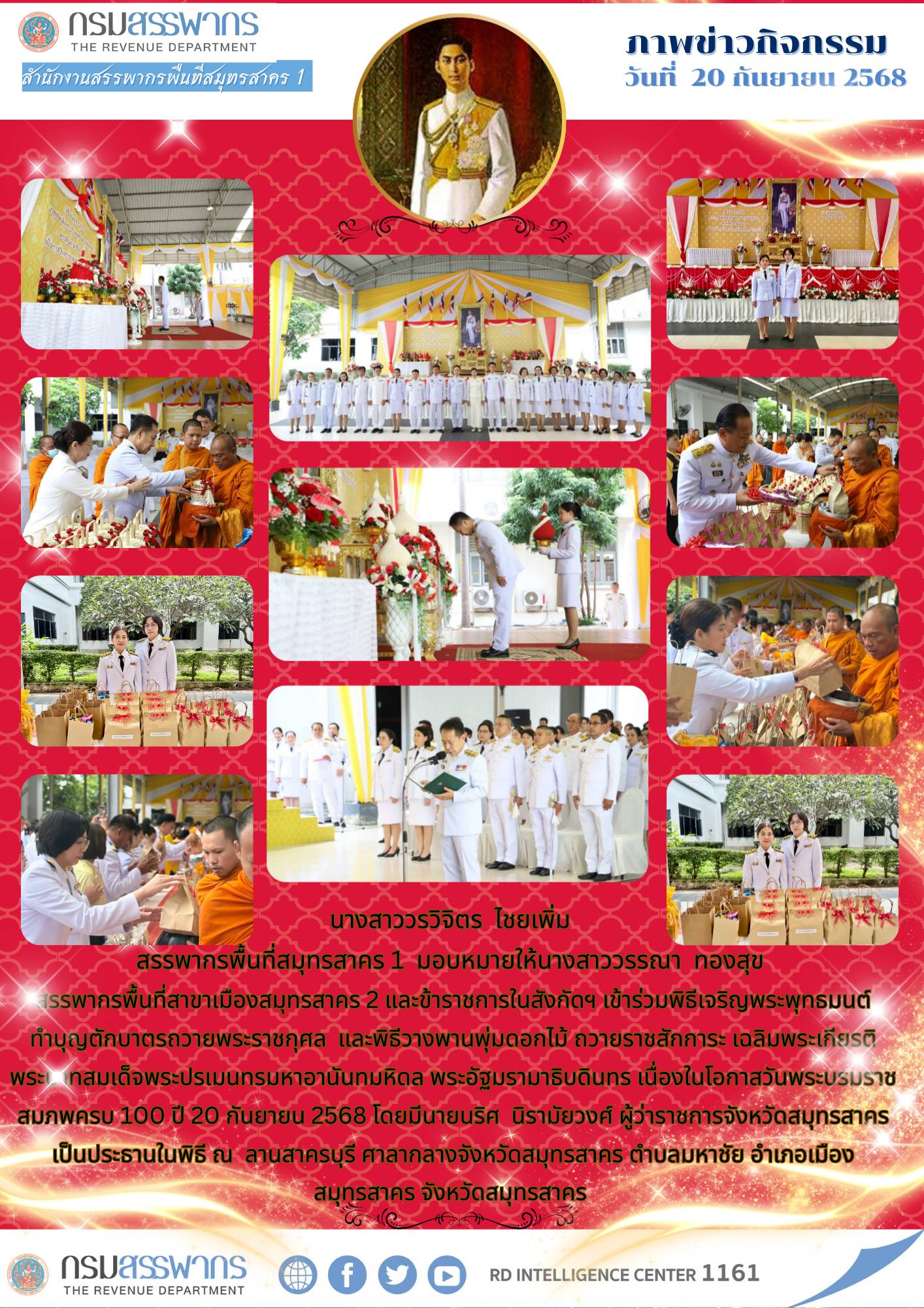 สำนักงานสรรพากรพื้นที่สมุทรสาคร 1 เข้าร่วมพิธีเจริญพระพุทธมนต์ ทำบุญตักบาตรถวายพระราชกุศล เนื่องในโอกาสวันพระบรมราชสมภพครบ 100 ปี ณ ลานสาครบุรี ศาลากลางจังหวัดสมุทรสาคร ตำบลมหาชัย อำเภอเมืองสมุทรสาคร จังหวัดสมุทรสาคร เมื่อวันที่ 20 กันยายน 2568