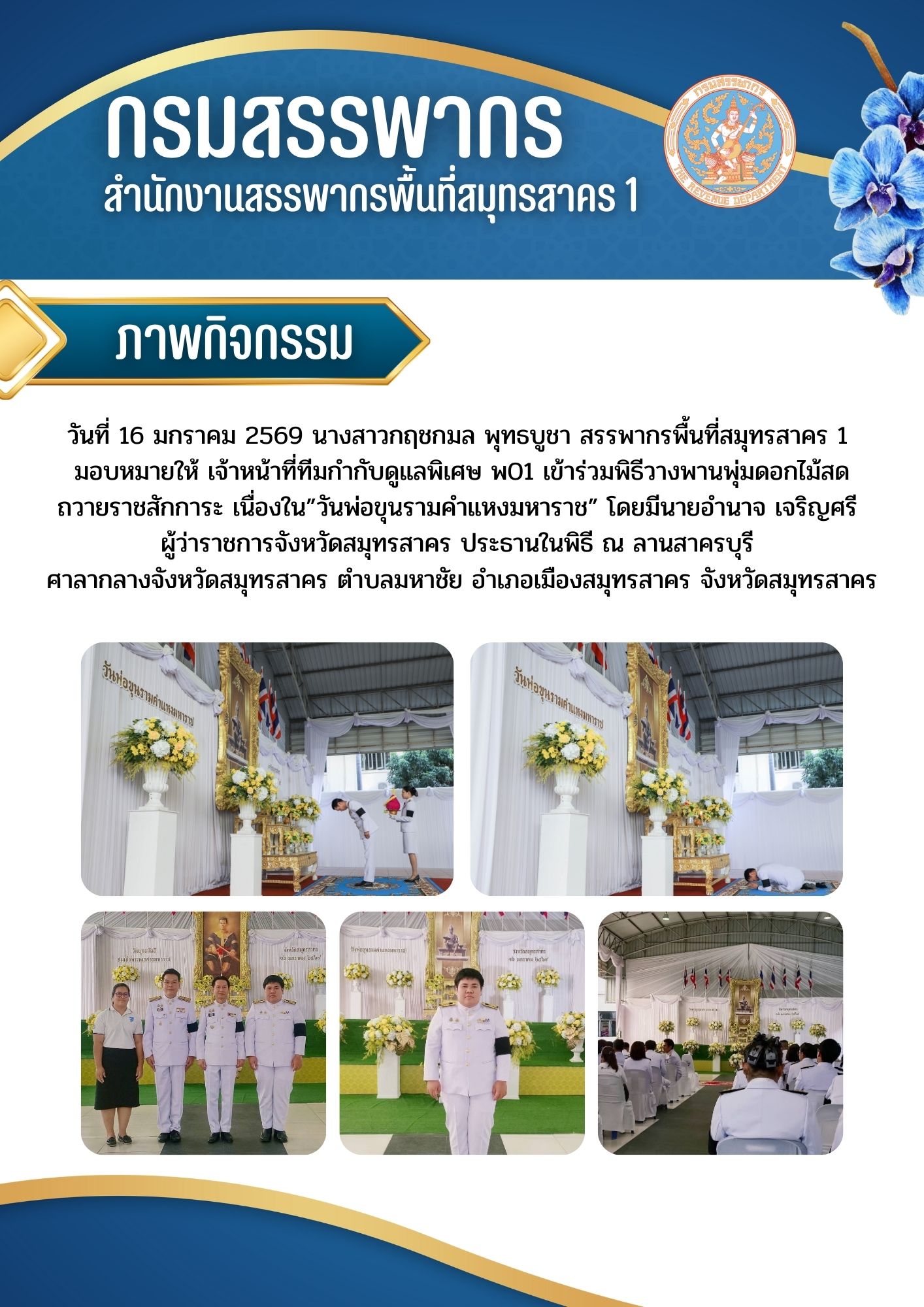 ภาพกิจกรรม สำนักงานสรรพากรพื้นที่สมุทรสาคร 1 เข้าร่วมพิธีวางพานพุ่มดอกไม้สดถวายราชสักการะเนื่องใน "วันพ่อขุนรามคำแหงมหาราช"