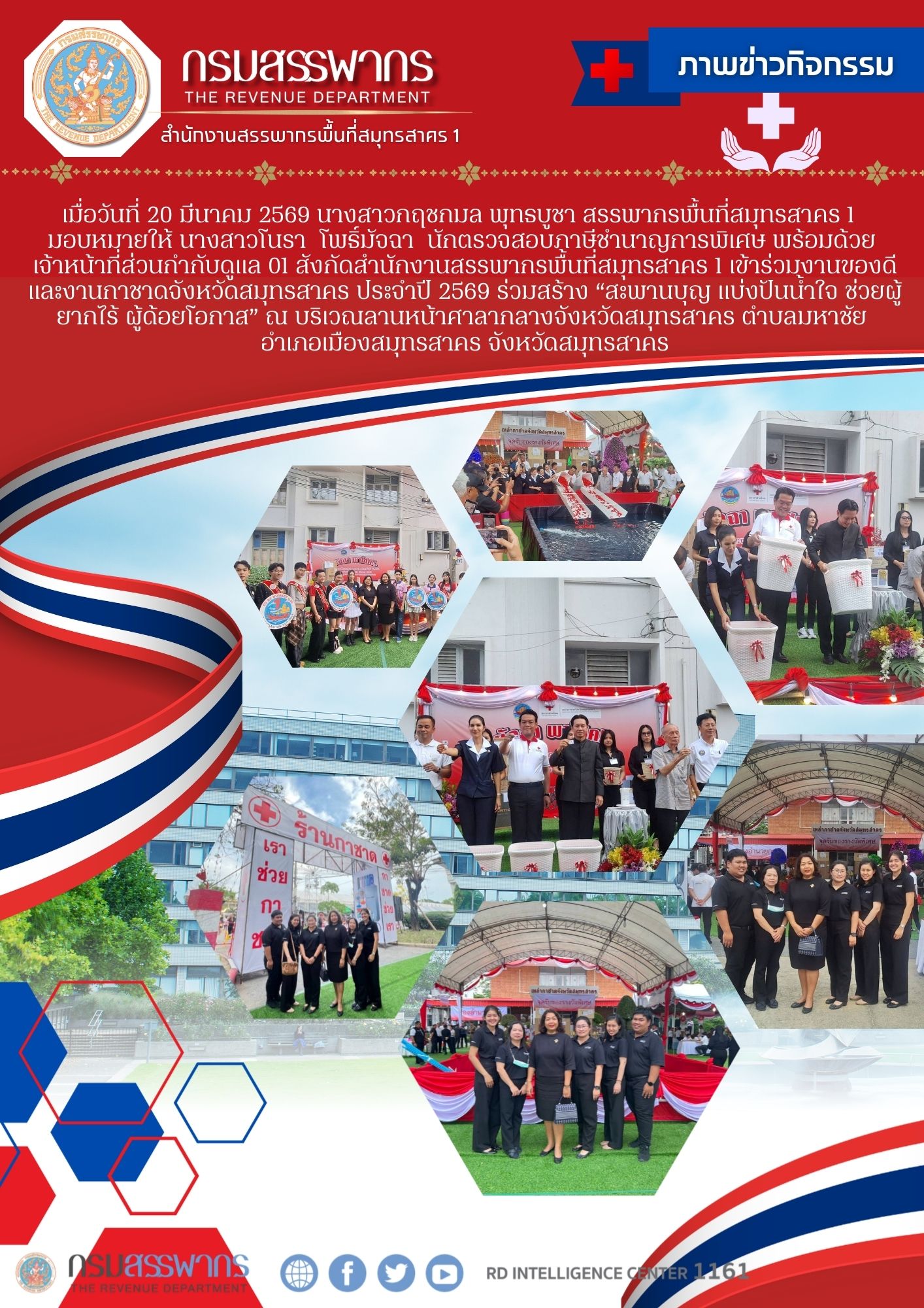 สำนักงานสรรพากรพื้นที่สมุทรสาคร 1 เข้าร่วมงานของดีและงานกาชาดจังหวัดสมุทรสาคร ประจำปี 2569 ร่วมเป็นสะพานบุญ แบ่งปันน้ำใจ ช่วยเหลือผู้ยากไร้ ผู้ด้อยโอกาส ณ บริเวณลานหน้าศาลากลางจังหวัดสมุทรสาคร เมื่อวันที่ 20 มีนาคา 2569