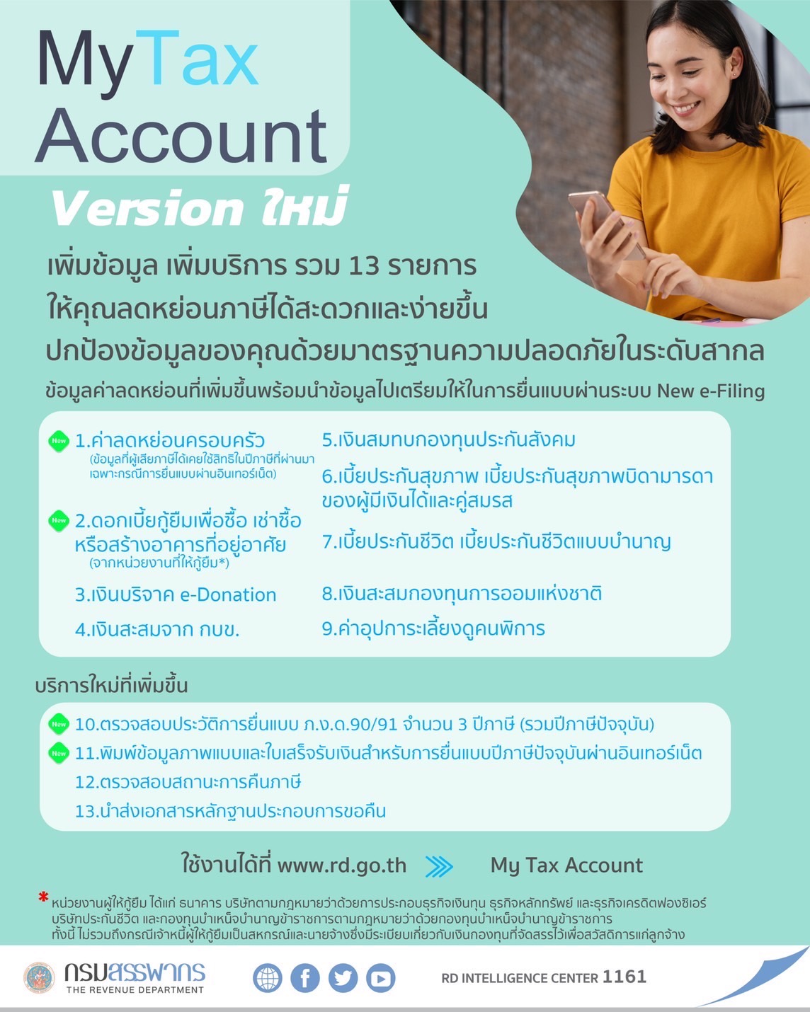 My Tax Account Version ใหม่ เพิ่มข้อมูล เพิ่มบริการ มากขึ้นถึง 13 รายการ ช่วยให้ผู้เสียภาษีดูค่าลดหย่อนได้ด้วยตนเอง สะดวกเข้าถึงง่ายทำได้ด้วยตนเอง ที่ www.rd.go.th