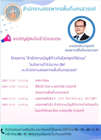 ขอเชิญผู้สนใจเข้าร่วมอบรม โครงการ "สำนักงานบัญชีก้าวทันโลกยุคดิจิตอล" วันอังคารที่ 12 มีนาคม พ.ศ. 2567