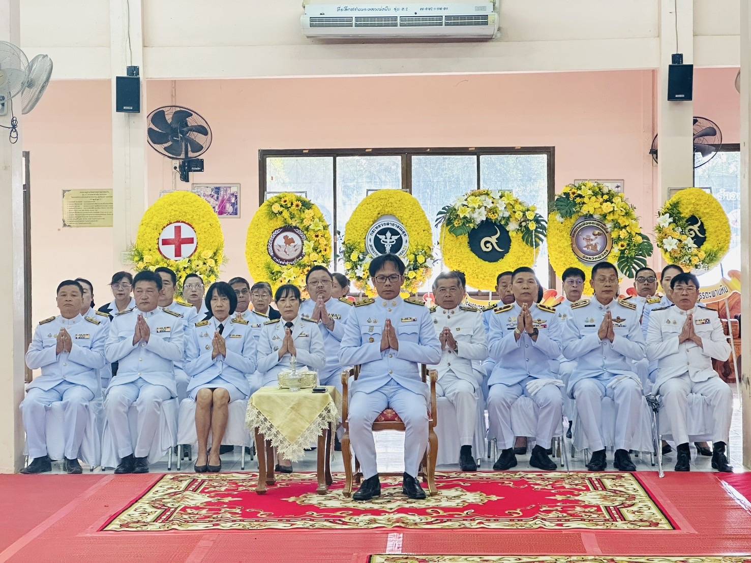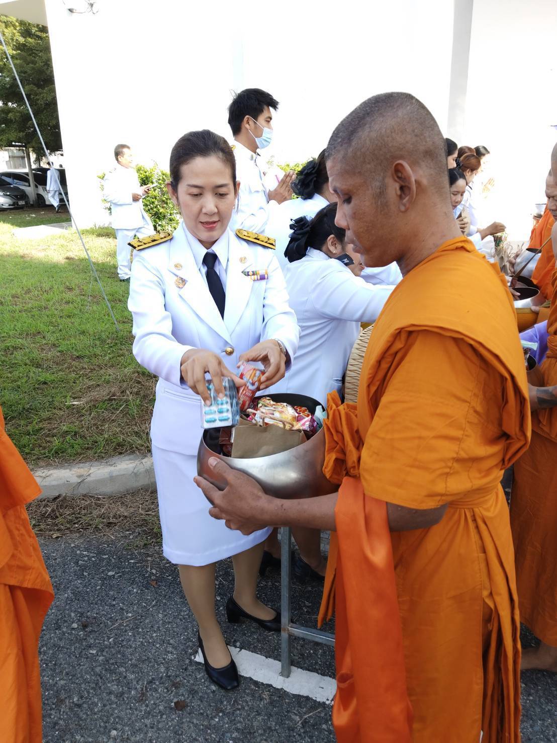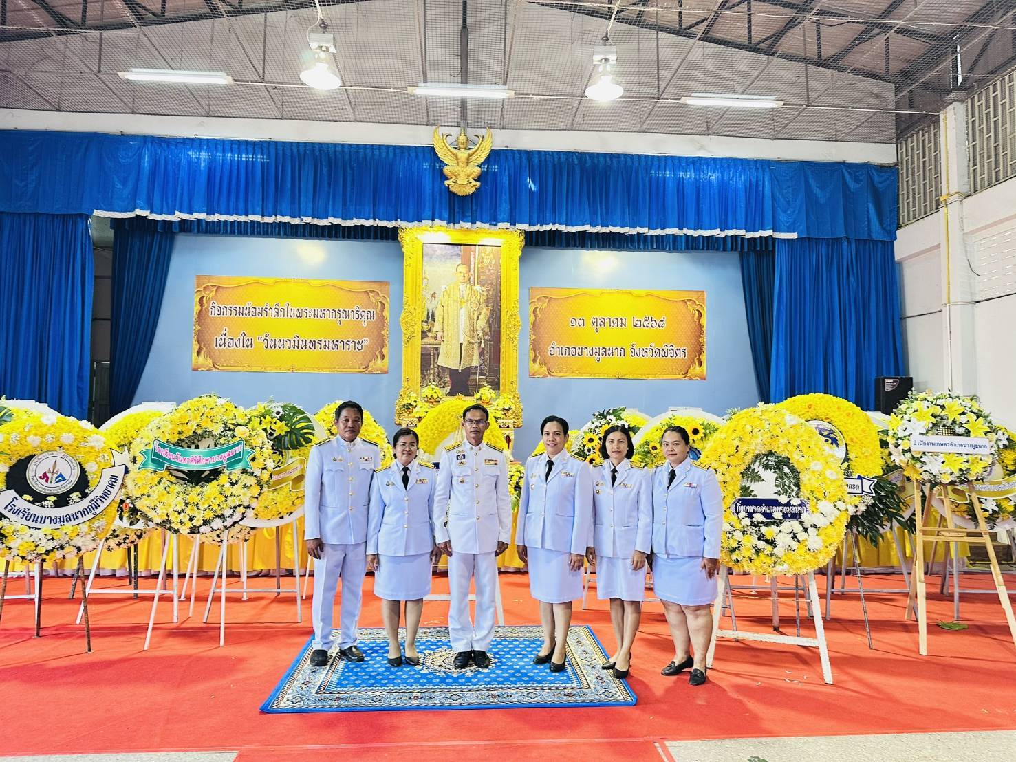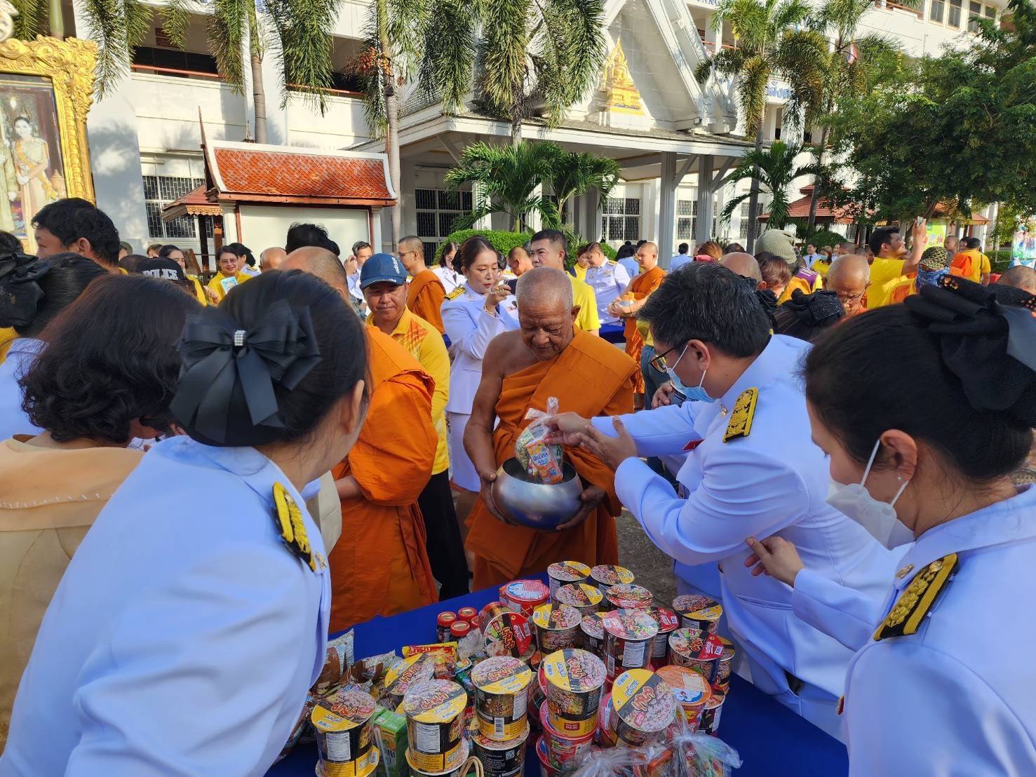 พิธีสวดพระพุทธมนต์ พิธีวางพวงมาลาและถวายราชสดุดี และพิธีตักบาตรถวายราชกุศล เนื่องในวันนวมินทรมหาราช