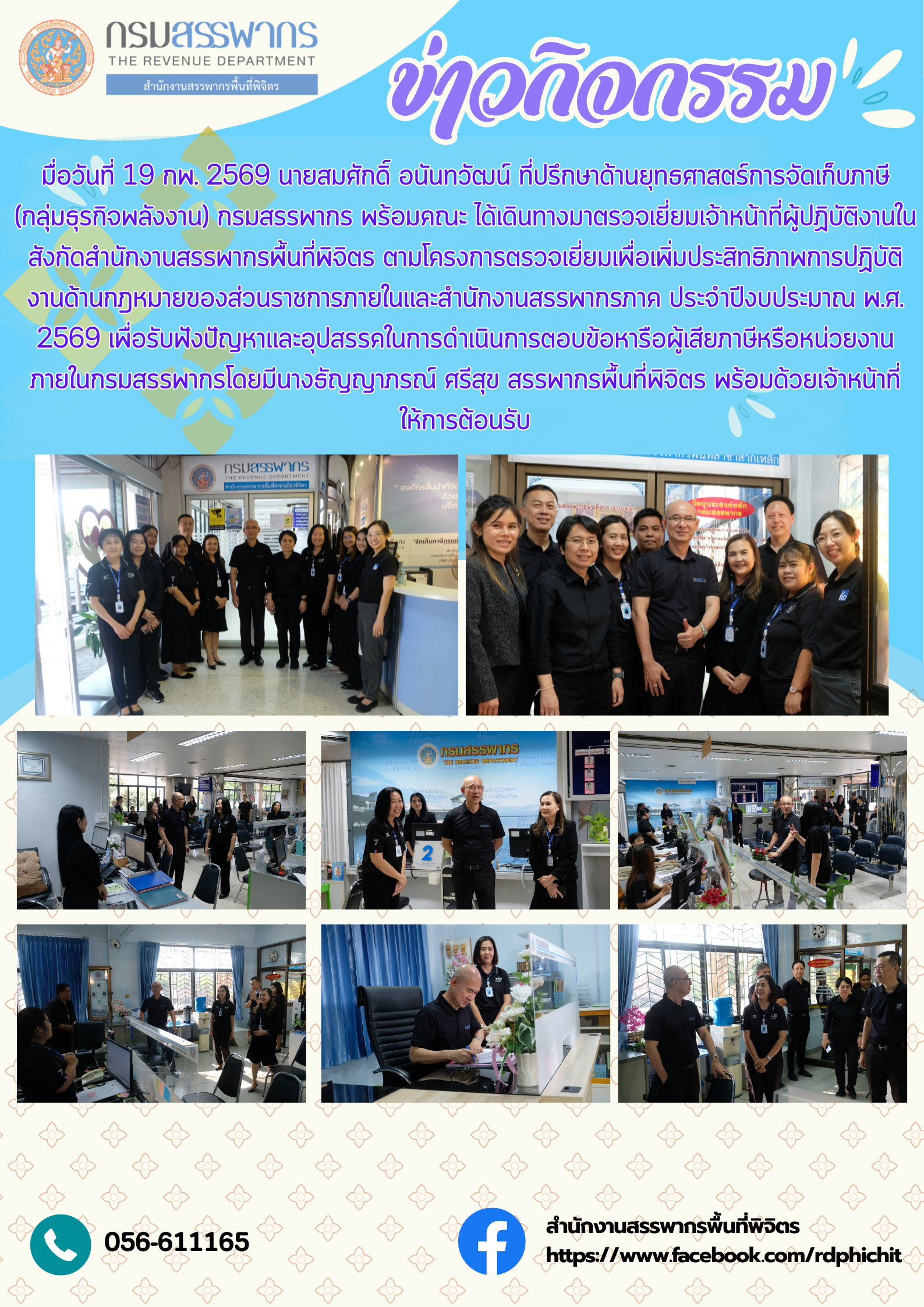 เมื่อวันที่ 19 กพ. 2569 นายสมศักดิ์ อนันทวัฒน์ ที่ปรึกษาด้านยุทธศาสตร์การจัดเก็บภาษี (กลุ่มธุรกิจพลังงาน) กรมสรรพากร พร้อมคณะ ได้เดินทางมาตรวจเยี่ยมเจ้าหน้าที่ผู้ปฏิบัติงานในสังกัดสำนักงานสรรพากรพื้นที่พิจิตร ตามโครงการตรวจเยี่ยมเพื่อเพิ่มประสิทธิภาพการปฏิบัติงานด้านกฎหมายของส่วนราชการภายในและสำนักงานสรรพากรภาค ประจำปีงบประมาณ พ.ศ. 2569 เพื่อรับฟังปัญหาและอุปสรรคในการดำเนินการตอบข้อหารือผู้เสียภาษีหรือหน่วยงานภายในกรมสรรพากรโดยมีนางธัญญาภรณ์ ศรีสุข สรรพากรพื้นที่พิจิตร พร้อมด้วยเจ้าหน้าที่ ให้การต้อนรับ
