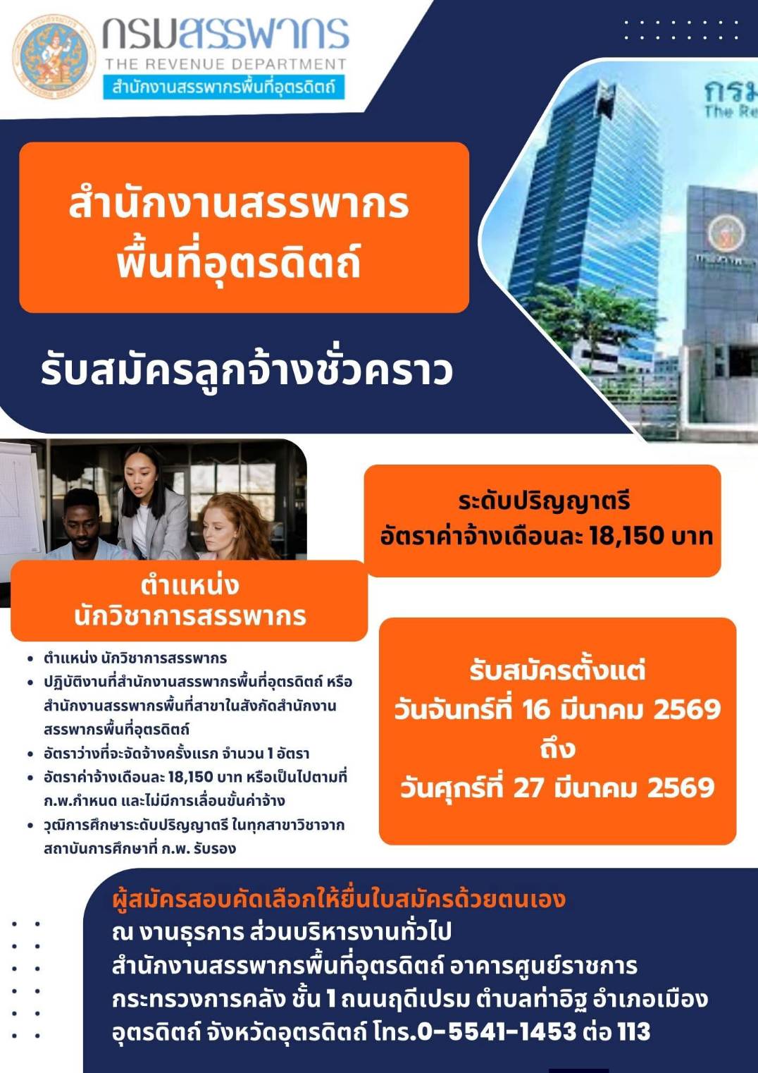 ประกาศสำนักงานสรรพากรพื้นที่อุตรดิตถ์ เรื่อง รับสมัครบุคคลเพื่อจัดจ้างเป็นลูกจ้างชั่วคราว ตำแหน่งนักวิชาการสรรพากร ลงวันที่ ๖ มีนาคม ๒๕๖๙