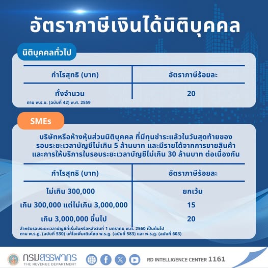 RD Intelligence Center : 1161 อัตราภาษีสำหรับนิติบุคคลทั่วไปและผู้ประกอบการ SMEs
