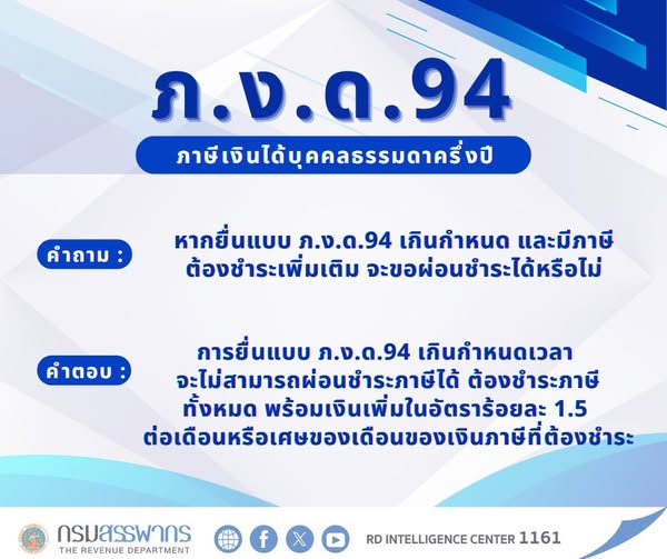 RD Intelligence Center : 1161 ยื่นแบบ ภ.ง.ด.94 เกินกำหนดเวลา ไม่สามารถผ่อนชำระภาษีได้‼