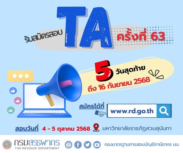 5 วัน สุดท้าย ประกาศ สรรพากรเปิดรับสมัคร Tax Auditor ครั้งที่ 63เปิดรับสมัคร 1-16 ก.ย. 68 นี้ ที่เว็บไซต์กรมสรรพากร www.rd.go.th /ผู้ตรวจสอบและรับรองบัญชี เท่านั้นมาร่วมเป็นผู้สอบบัญชีภาษีอากรกับกรมสรรพากร เพื่อร่วมพัฒนาระบบบัญชีให้มีประสิทธิภาพยิ่งขึ้นกัน ห้ามพลาด!
