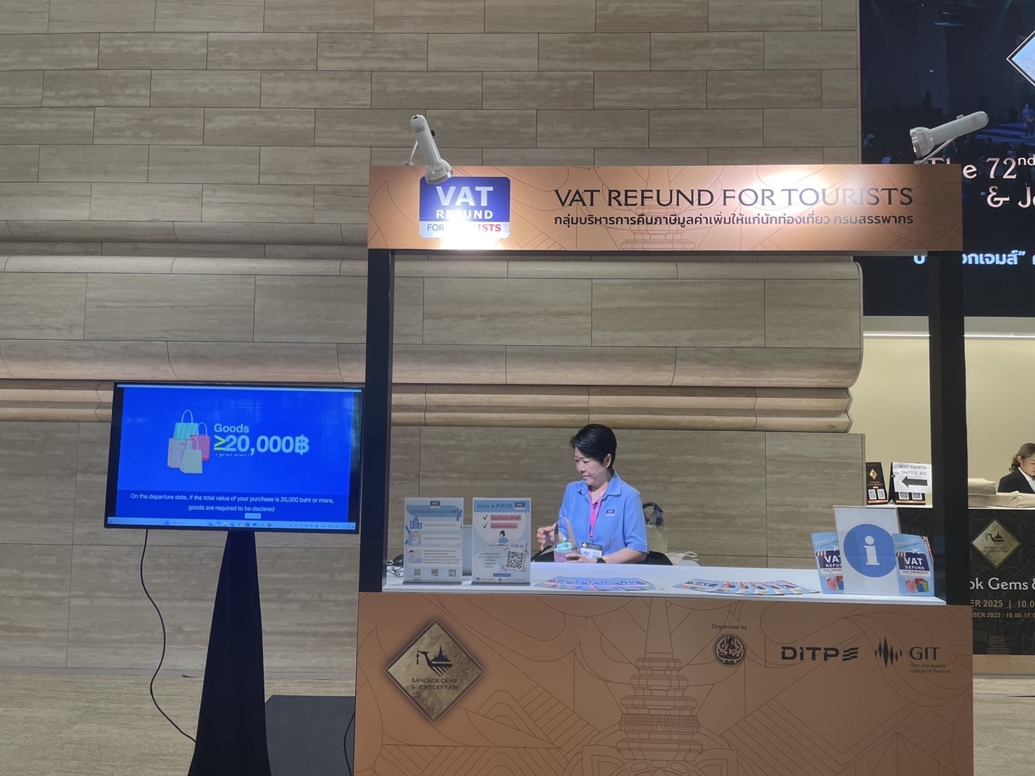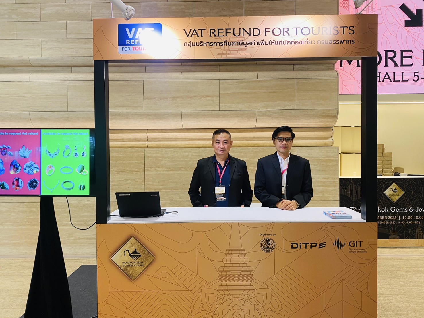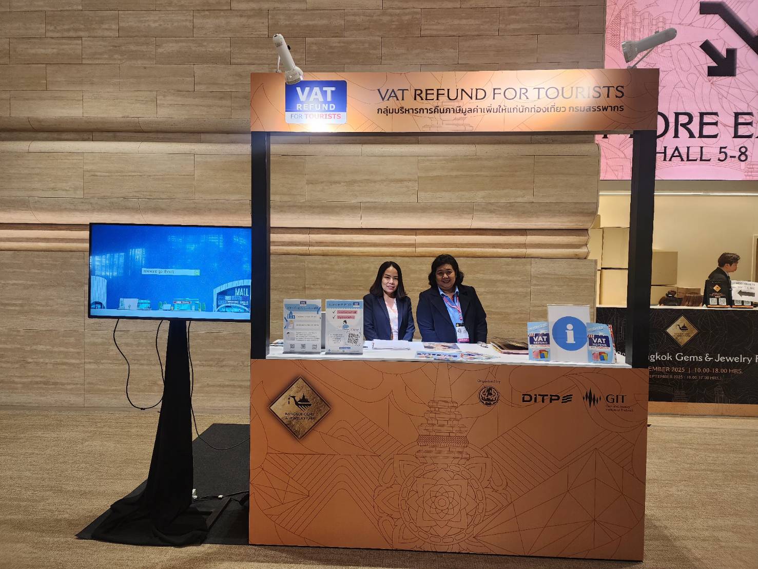 กลุ่มบริหารการคืนภาษีมูลค่าเพิ่มให้แก่นักท่องเที่ยว กรมสรรพากรได้เข้าร่วมงานจัดแสดงสินค้าอัญมณีและเครื่องประดับครั้งที่ 72 (The 72 Bangkok Gems and Jewelry Fair)เพื่อให้คำแนะนำแก่ผู้ประกอบการและนักท่องเที่ยวชาวต่างชาติเกี่ยวกับการคืนภาษีมูลค่าเพิ่มให้แก่นักท่องเที่ยว (VAT Refund for Tourists)จัดโดย กรมส่งเสริมการค้าระหว่างประเทศ ระหว่างวันที่ 9 - 13 กันยายน 2568 ณ ศูนย์ประชุมแห่งชาติสิริกิติ์