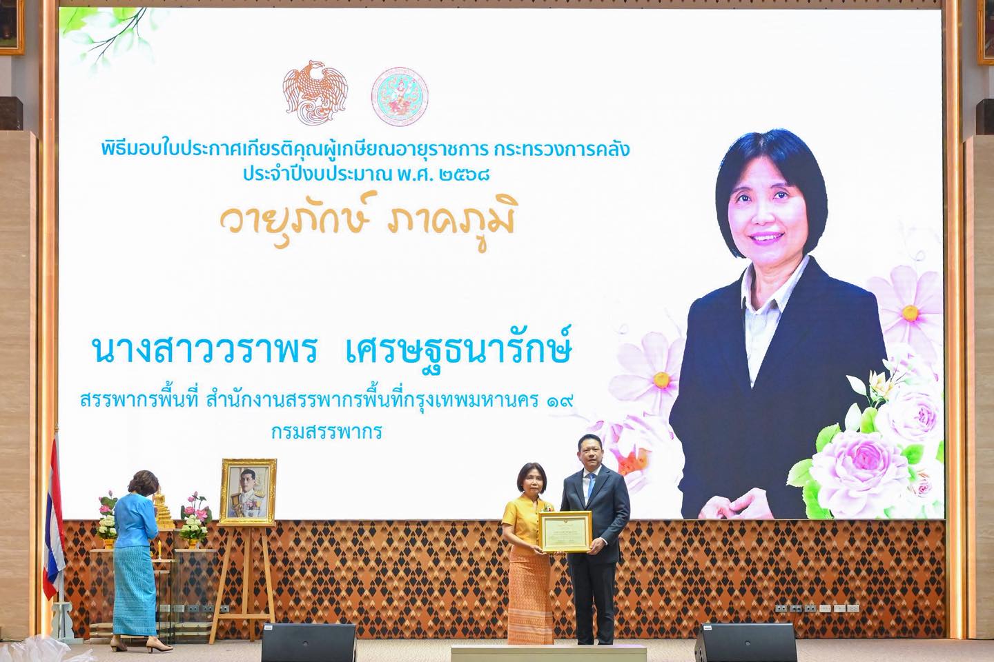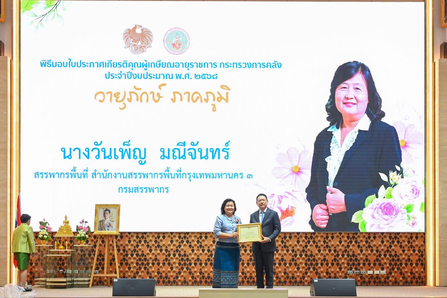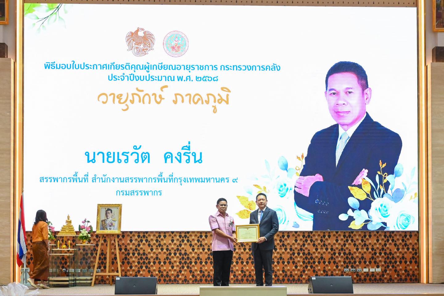 พิธีมอบใบประกาศเกียรติคุณผู้เกษียณอายุราชการ ประจำปีงบประมาณ พ.ศ. 2568 นายลวรณ แสงสนิท ปลัดกระทรวงการคลัง เป็นประธานในพิธีมอบใบประกาศเกียรติคุณผู้เกษียณอายุราชการ ประจำปีงบประมาณ พ.ศ. 2568 โดยมีนายปิ่นสาย สุรัสวดี อธิบดีกรมสรรพากร พร้อมคณะผู้บริหารที่เกษียณอายุราชการของกรมสรรพากร เข้าร่วมพิธีเมื่อวันที่ 19 กันยายน 2568 ณ ห้องกำปั่นทอง ชั้น 21 อาคาร 150 ปี กระทรวงการคลัง