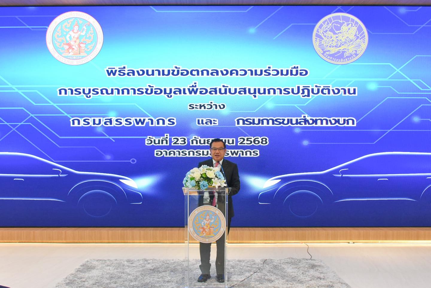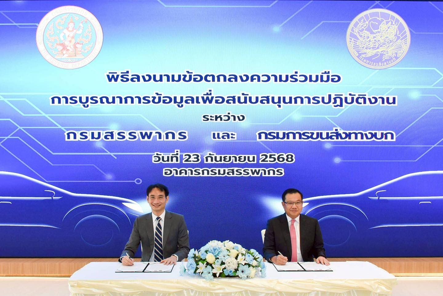กรมสรรพากรจับมือกรมการขนส่งทางบก ลงนามบันทึกข้อตกลงความร่วมมือการบูรณาการข้อมูลเพื่อสนับสนุนการปฏิบัติงาน นายปิ่นสาย สุรัสวดี อธิบดีกรมสรรพากร พร้อมด้วยนายจิรุตม์ วิศาลจิตร อธิบดีกรมการขนส่งทางบก ได้ร่วมลงนามบันทึกข้อตกลงความร่วมมือการบูรณาการข้อมูลเพื่อสนับสนุนการปฏิบัติงาน โดยมีเป้าหมายเพื่อเพิ่มประสิทธิภาพการจัดเก็บภาษีอากร ให้ครอบคลุมและเป็นธรรม ควบคู่กับการยกระดับการให้บริการประชาชนของทั้งสองหน่วยงานให้เกิดประสิทธิภาพสูงสุด เมื่อวันอังคารที่ 23 กันยายน 2568 ณ อาคารกรมสรรพากร