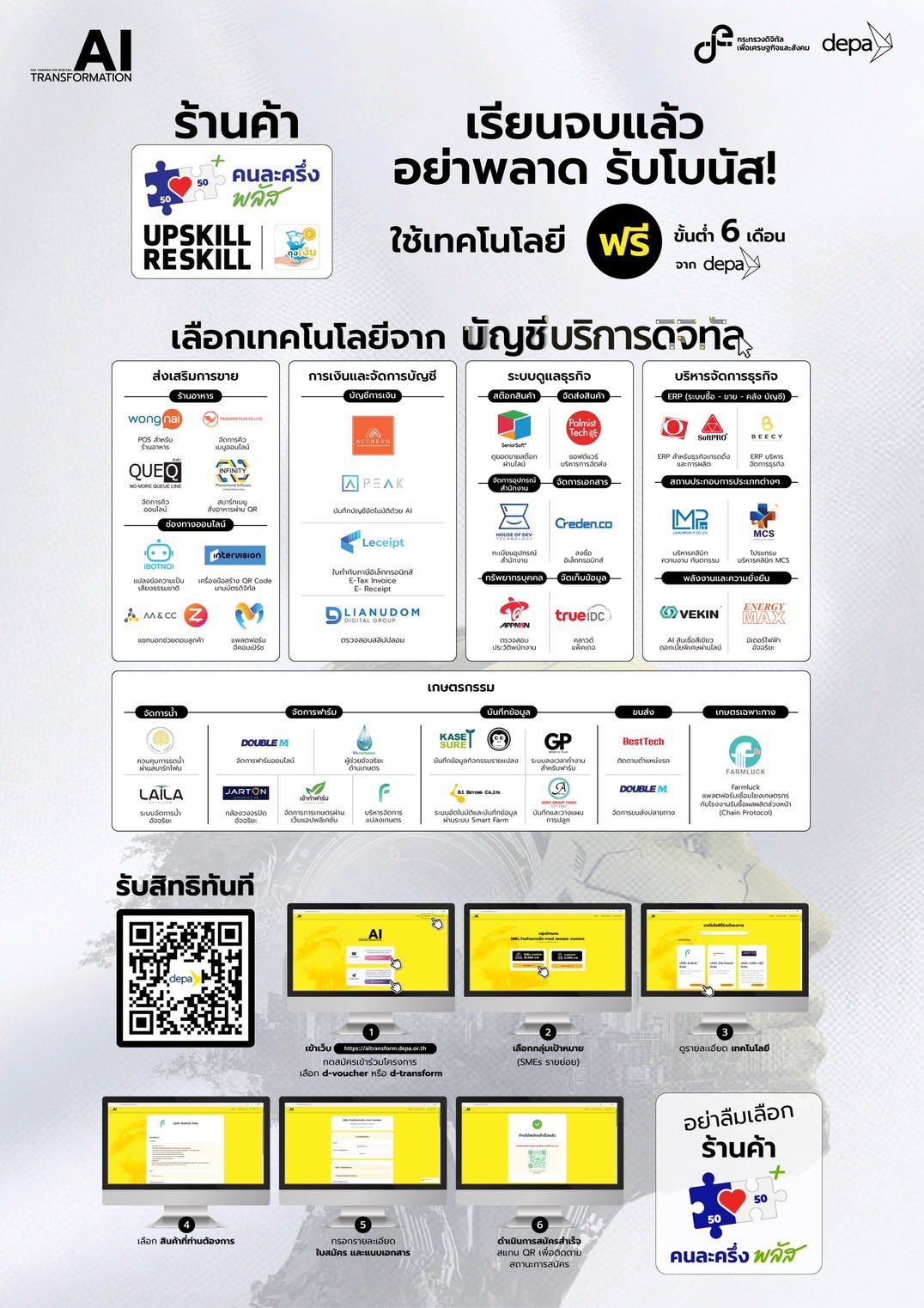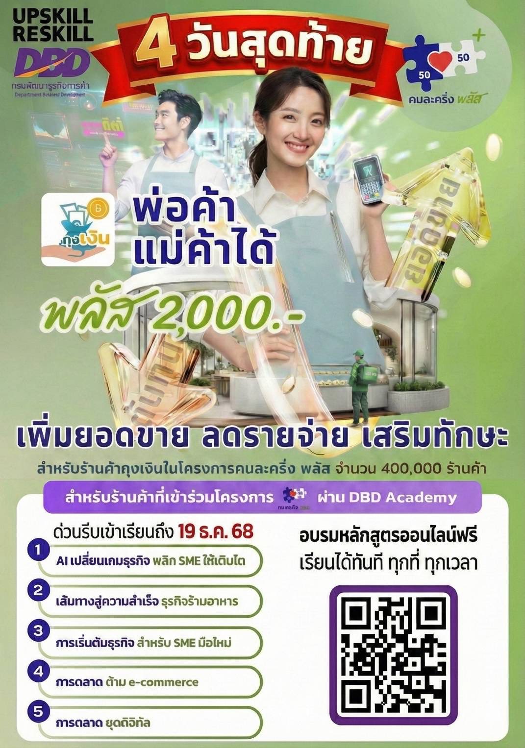 โค้งสุดท้าย โครงการพัฒนาความรู้ทักษะ (Upskill) หรือเรียนรู้ทักษะใหม่ (Reskill) สำหรับร้านค้าที่เข้าร่วมโครงการคนละครึ่ง พลัส เมื่อร้านค้าเข้าร่วมโครงการเรียบร้อยแล้ว จะได้รับสิทธิเงินสนับสนุนจากภาครัฐ ร้อยละ 20 ของยอดขายที่เกิดจาก โครงการคนละครึ่ง พลัส เฉพาะในส่วนที่ภาครัฐร่วมจ่าย นับตั้งแต่วันที่ร้านค้าได้ดำเนินการ Upskill หรือ Reskill สำเร็จ จนถึงวันที่ 19 ธันวาคม 2568 ทั้งนี้ สูงสุดไม่เกิน 2,000 บาท ต่อร้านค้า โดยกระทรวงการคลัง โดยกรมบัญชีกลาง จะโอนเงินดังกล่าวให้แก่ร้านค้าผ่านบัญชีธนาคารกรุงไทย จำกัด (มหาชน) ที่ผูกกับแอปพลิเคชัน “ถุงเงิน” ในวันที่ 25 ธันวาคม 2568 ซึ่งร้านค้าสามารถเข้าร่วมโครงการได้ตั้งแต่วันนี้เป็นต้นไป จนถึงวันที่ 19 ธันวาคม 2568