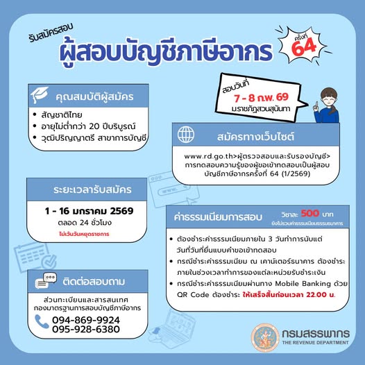 ประกาศ กรมสรรพากรเปิดรับสมัคร Tax Auditor ครั้งที่ 64 เปิดรับสมัคร 1-16 ม.ค. 69 นี้ ที่เว็บไซต์กรมสรรพากร www.rd.go.th /ผู้ตรวจสอบและรับรองบัญชี เท่านั้น