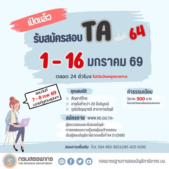 ประกาศ กรมสรรพากรเปิดรับสมัคร Tax Auditor ครั้งที่ 64 เปิดรับสมัคร 1-16 ม.ค. 69 นี้ ที่เว็บไซต์กรมสรรพากร www.rd.go.th /ผู้ตรวจสอบและรับรองบัญชี เท่านั้นมาร่วมเป็นผู้สอบบัญชีภาษีอากรกับกรมสรรพากร เพื่อร่วมพัฒนาระบบบัญชีให้มีประสิทธิภาพยิ่งขึ้นกัน ห้ามพลาด! ทดสอบวันที่ 7-8 ก.พ. 69