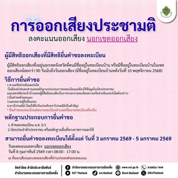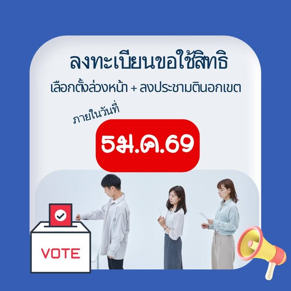 - กรณีผู้เข้าทดสอบในวันที่ 8 ก.พ.69 และต้องการใช้สิทธิเลือกตั้ง สส. ท่านสามารถแจ้งเลือกตั้งล่วงหน้าได้ในวันที่ 1 ก.พ. 69 โดยยื่นขอใช้สิทธิออกเสียงลงคะแนนก่อนวันเลือกตั้ง วันที่ 20 ธ.ค.68 - 5 ม.ค.69 และสามารถยื่นคำขอลงทะเบียนออกเสียงประชามติ ลงคะแนนออกเสียง นอกเขตออกเสียง วันที่ 3 ม.ค.69 - 5 ม.ค.69