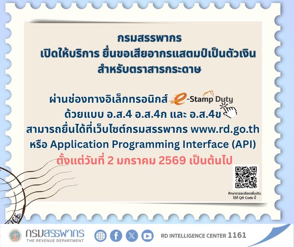 กรมสรรพากรเปิดให้บริการ ยื่นขอเสียอากรแสตมป์เป็นตัวเงินสำหรับตราสารกระดาษ