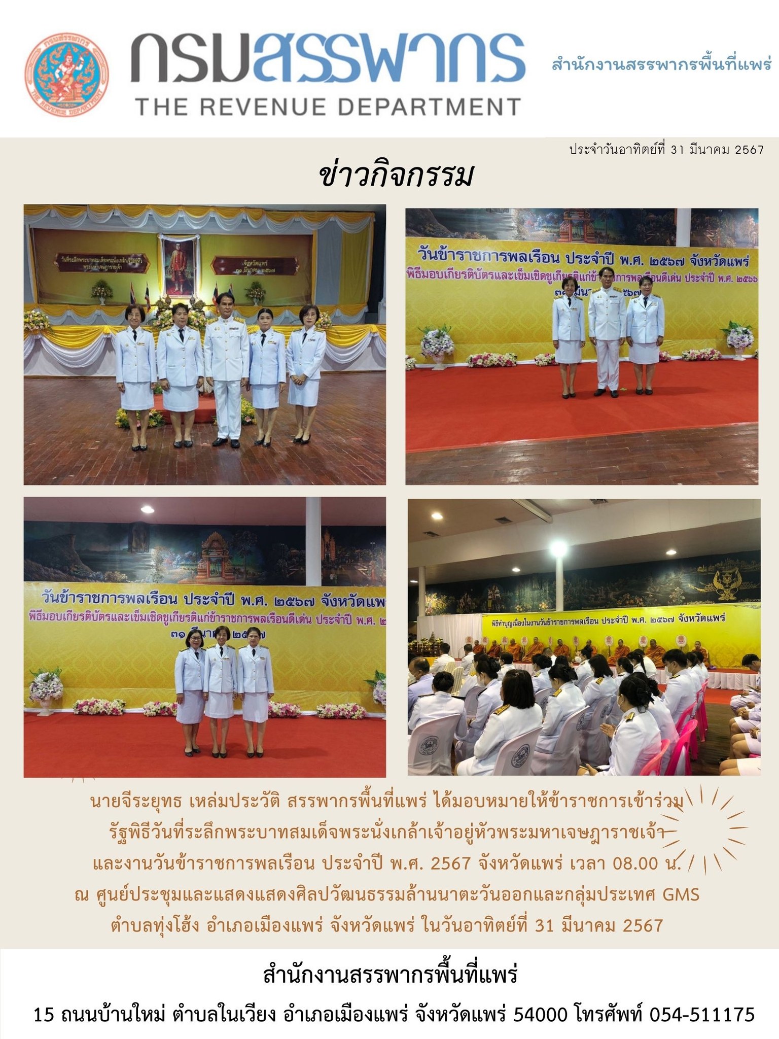 ได้มอบหมายให้ข้าราชการเข้าร่วมรัฐพิธีวันที่ระลึกพระบาทสมเด็จพระนั่งเกล้าเจ้าอยู่หัวพระมหาเจษฎาราชเจ้า และงานวันข้าราชการพลเรือน ประจำปี พ.ศ. 2567 จังหวัดแพร่ เวลา 08.00 น. ณ ศูนย์ประชุมและแสดงแสดงศิลปวัฒนธรรมล้านนาตะวันออกและกลุ่มประเทศ GMS ตำบลทุ่งโฮ้ง อำเภอเมืองแพร่ จังหวัดแพร่ ในวันอาทิตย์ที่ 31 มีนาคม 2567