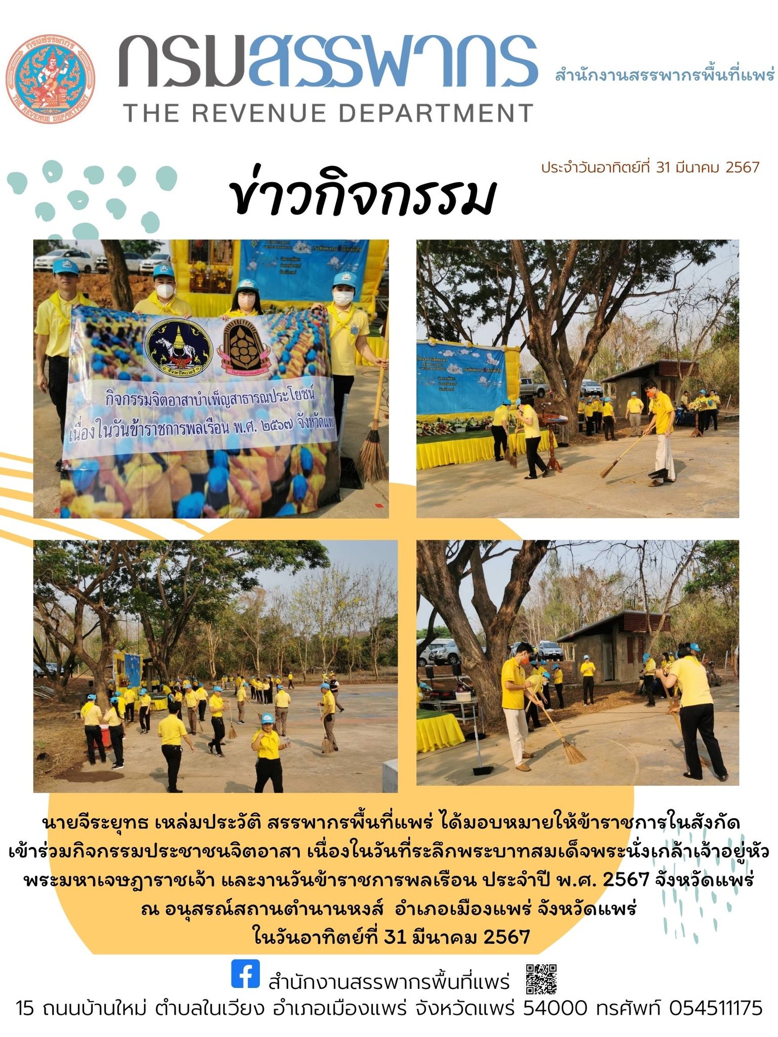 ได้มอบหมายให้ข้าราชการในสังกัดเข้าร่วมกิจกรรมประชาชนจิตอาสา เนื่องในวันที่ระลึกพระบาทสมเด็จพระนั่งเกล้าเจ้าอยู่หัวพระมหาเจษฎาราชเจ้า และงานวันข้าราชการพลเรือน ประจำปี พ.ศ. 2567 จังหวัดแพร่ ณ อนุสรณ์สถานตำนานหงส์ อำเภอเมืองแพร่ จังหวัดแพร่ ในวันอาทิตย์ที่ 31 มีนาคม 2567